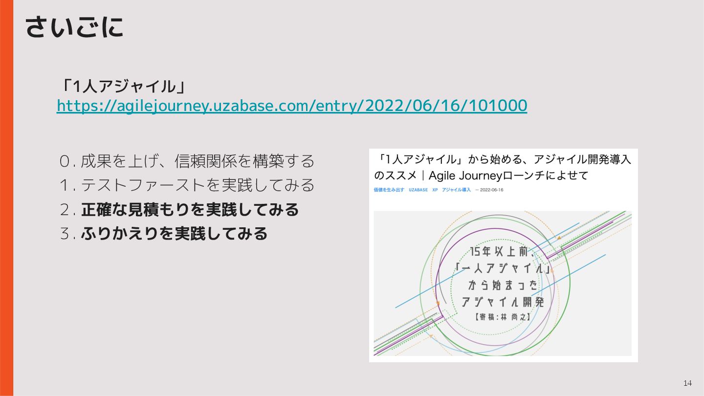 14 さいごに 「1人アジャイル」 https://agilejourney.uzabase.com/entry/2022/06/16/101000 0. 成果を上げ、信頼関係を構築する 1. テストファーストを実践してみる 2. 正確な見積もりを実践してみる