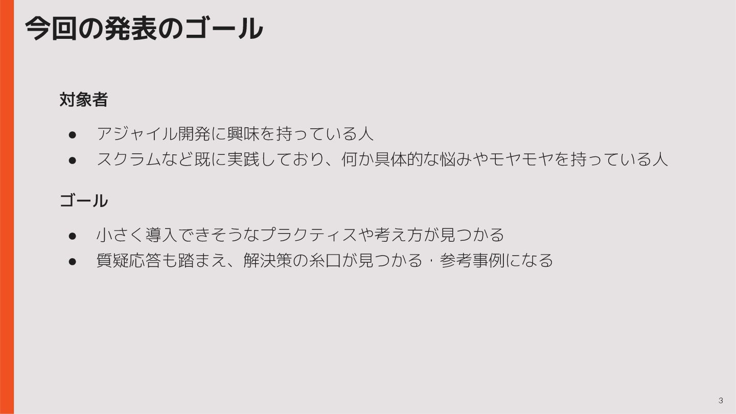 3 対象者 • アジャイル開発に興味を持っている人 • スクラムなど既に実践しており、何か具体的な悩みやモヤモヤを持っている人 ゴール • 小さく導入できそうなプラクティスや考え方が見つかる •