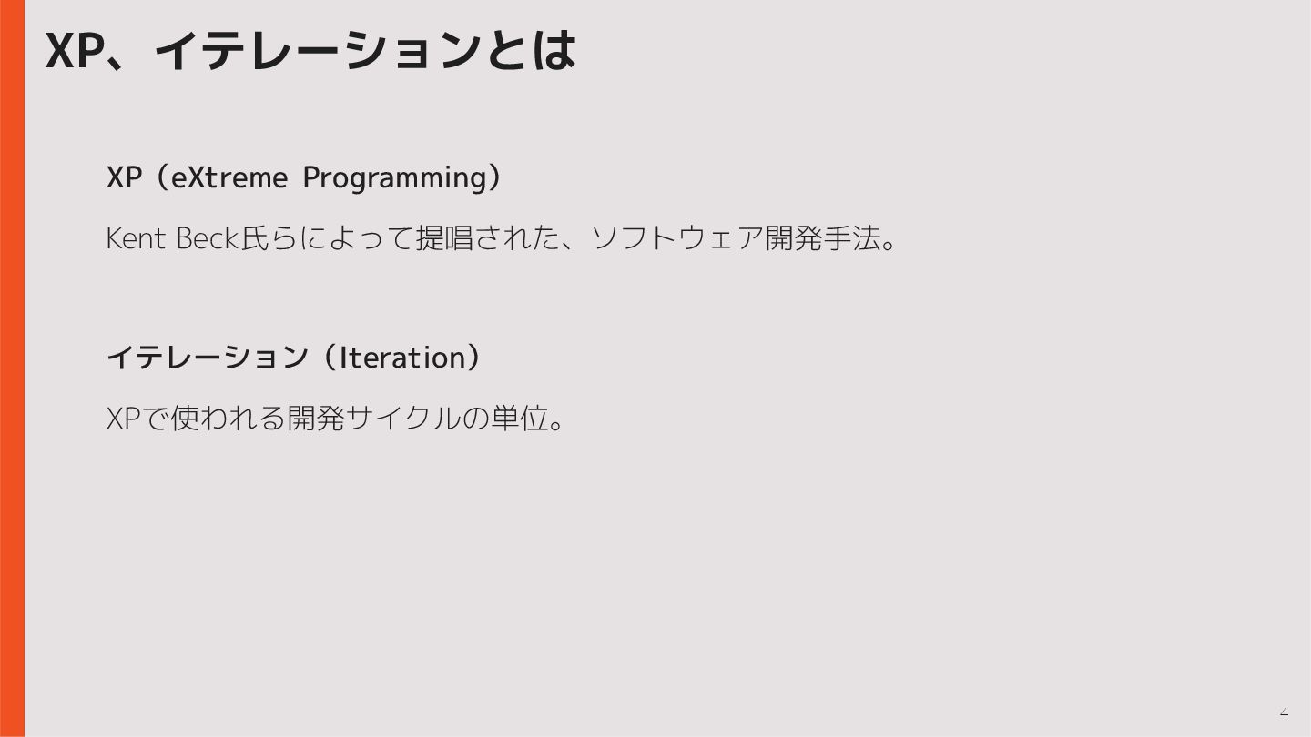 4 XP、イテレーションとは XP(eXtreme Programming) Kent Beck氏らによって提唱された、ソフトウェア開発手法。 イテレーション(Iteration) XPで使われる開発サイクルの単位。