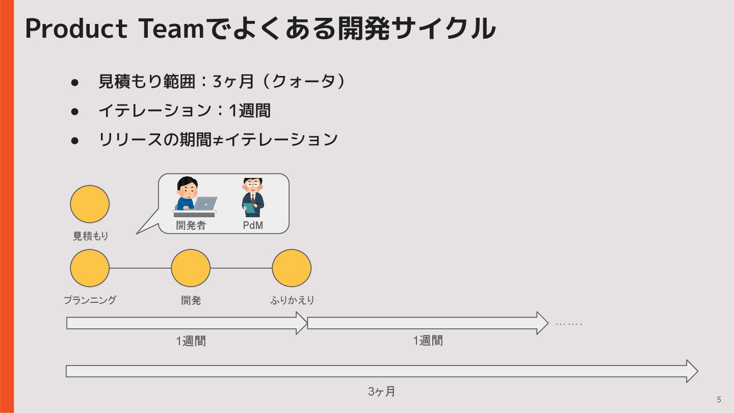 1週間 1週間 ……. プランニング 開発 ふりかえり 見積もり 開発者 PdM