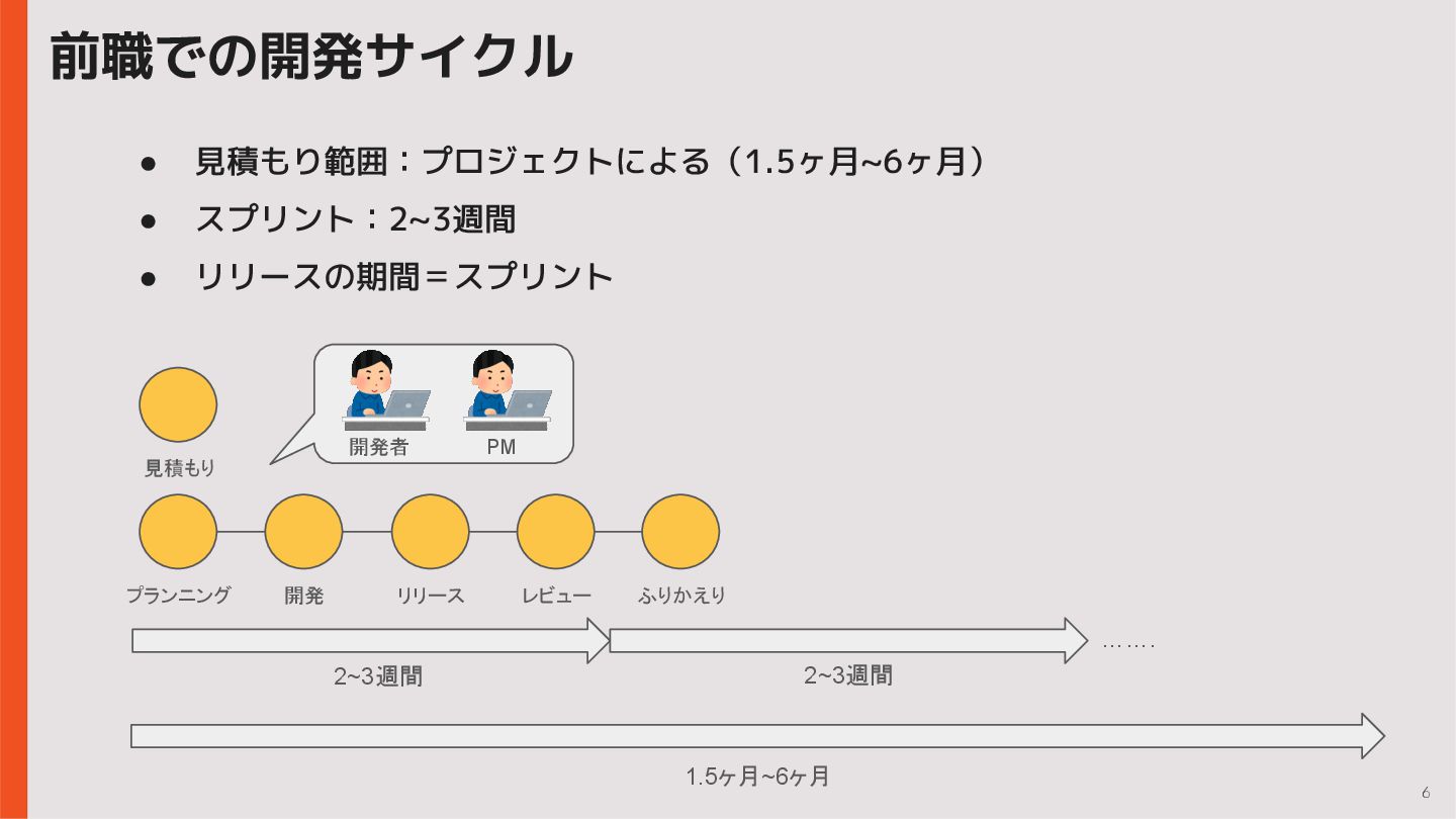 6 前職での開発サイクル 1.5ヶ月~6ヶ月 2~3週間 2~3週間 ……. プランニング 開発 リリース レビュー