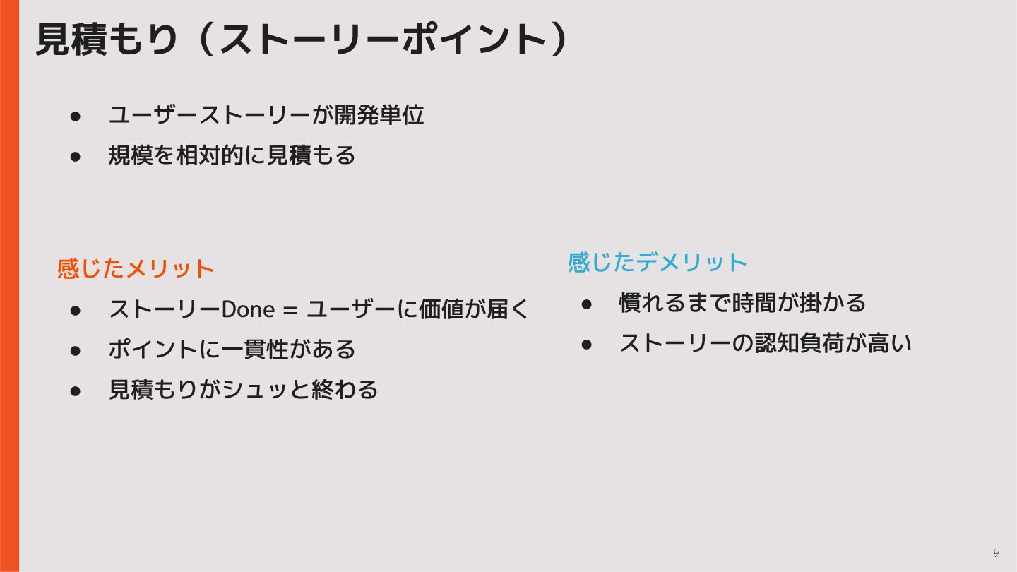 8 • ユーザーストーリーが開発単位 • 規模を相対的に見積もる 見積もり(ストーリーポイント) • 開発タスクが開発単位 • 時間を見積もる