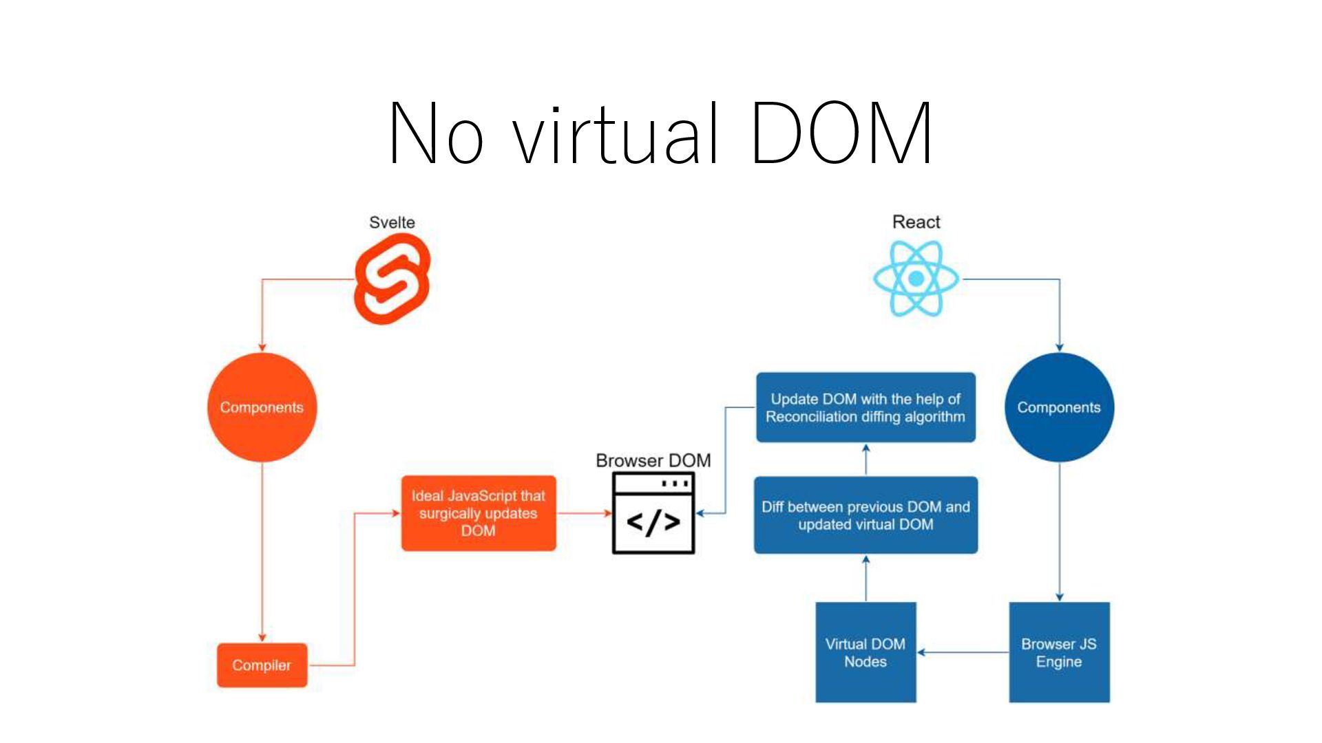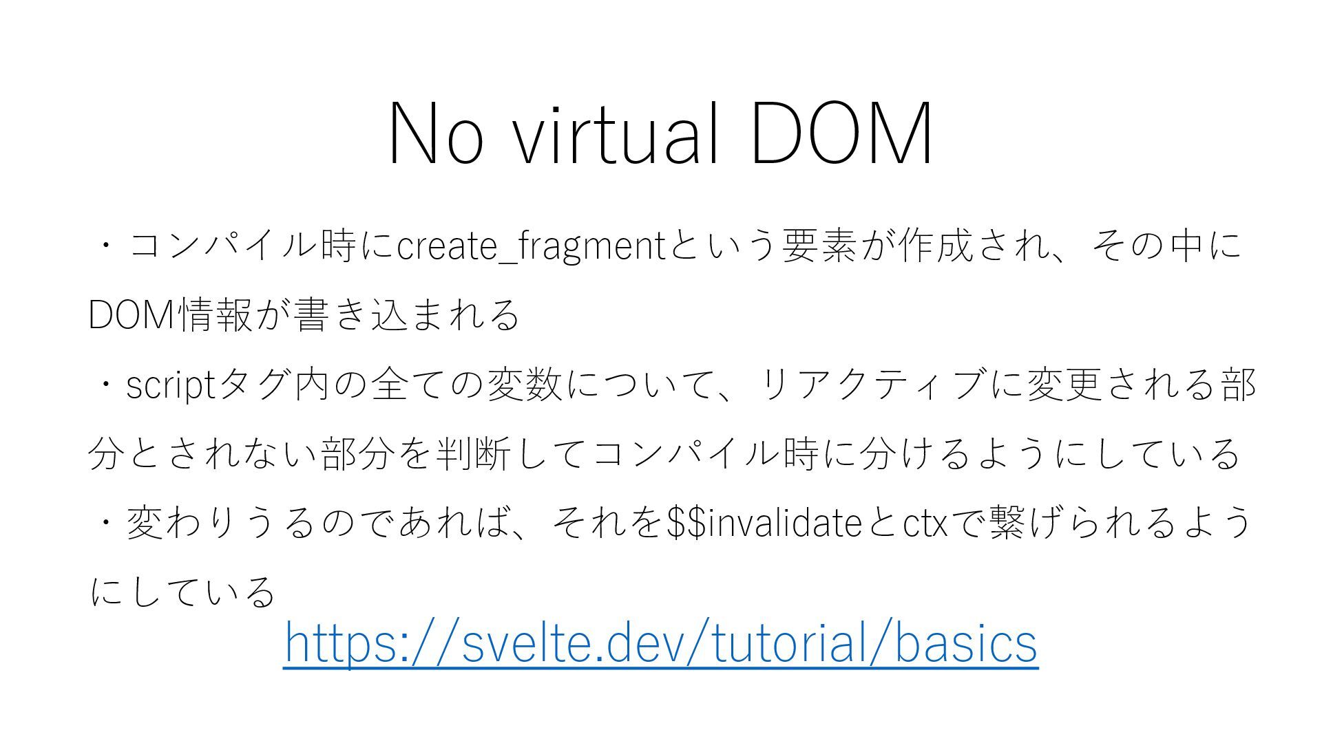 No virtual DOM https://svelte.dev/tutorial/basics ・コンパイル時にcreate_fragmentという要素が作成され、その中に DOM情報が書き込まれる ・scriptタグ内の全ての変数について、リアクティブに変更される部 分とされない部分を判断してコンパイル時に分けるようにしている ・変わりうるのであれば、それを$$invalidateとctxで繋げられるよう にしている