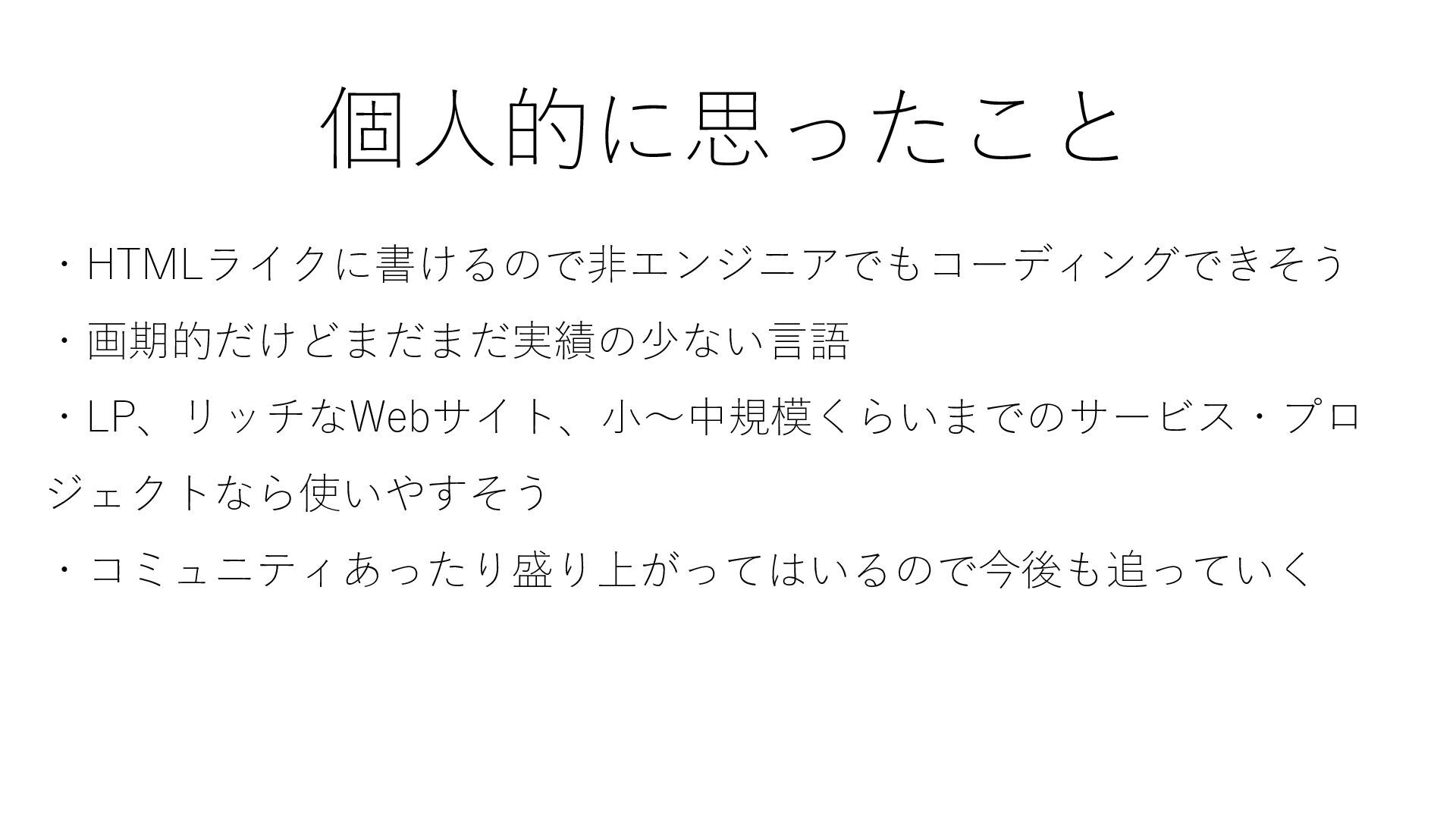 個人的に思ったこと ・HTMLライクに書けるので非エンジニアでもコーディングできそう ・画期的だけどまだまだ実績の少ない言語 ・LP、リッチなWebサイト、小〜中規模くらいまでのサービス・プロ ジェクトなら使いやすそう ・コミュニティあったり盛り上がってはいるので今後も追っていく