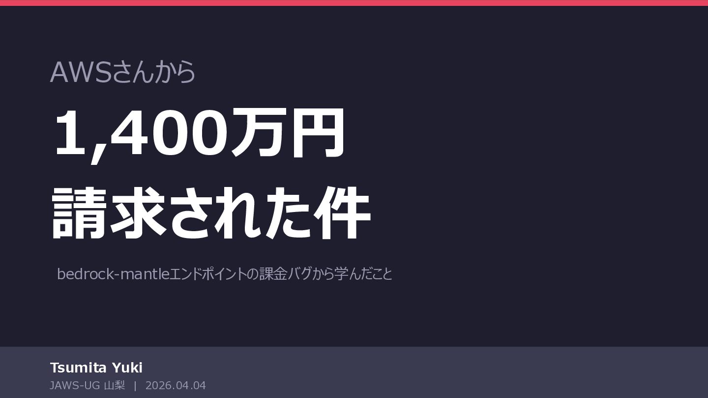 AWSさんから 1,400万円 請求された件 bedrock-mantleエンドポイントの課金バグから学んだこと Tsumita Yuki JAWS-UG 山梨 | 2026.04.04