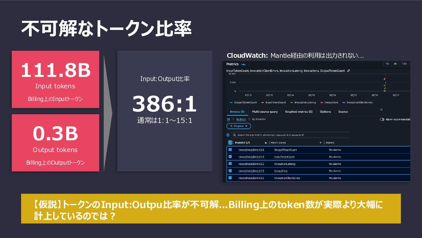 不可解なトークン比率 111.8B Input tokens Billing上のInputトークン 386:1 通常は1:1〜15:1 Input:Output比率 CloudWatch: Mantle経由の利用は出力されない...