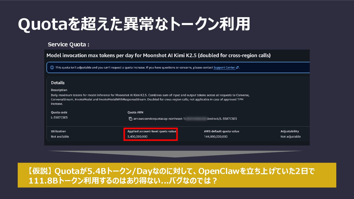 Quotaを超えた異常なトークン利用 Service Quota: 【仮説】 Quotaが5.4Bトークン/Dayなのに対して、OpenClawを立ち上げていた2日で 111.8Bトークン利用するのはあり得ない...バグなのでは?