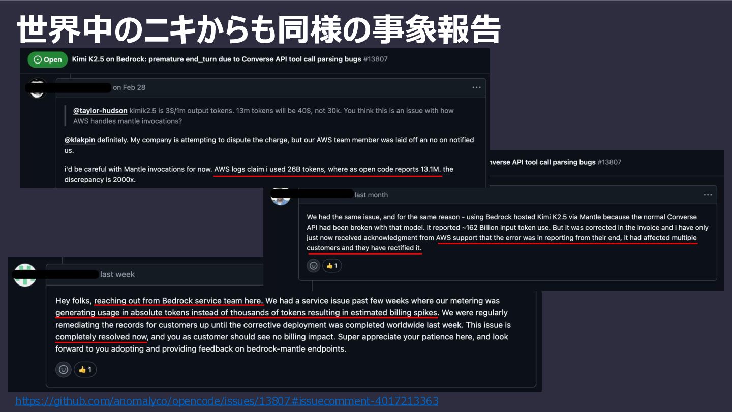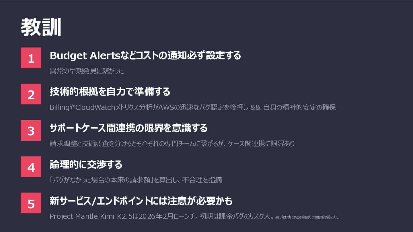 3 サポートケース間連携の限界を意識する 請求調整と技術調査を分けるとそれぞれの専門チームに繋がるが、ケース間連携に限界あり 4 論理的に交渉する 「バグがなかった場合の本来の請求額」を算出し、不合理を指摘 5 新サービス/エンドポイントには注意が必要かも Project Mantle Kimi K2.5は2026年2月ローンチ。初期は課金バグのリスク大。直近は他でも課金周りの問題複数あり..