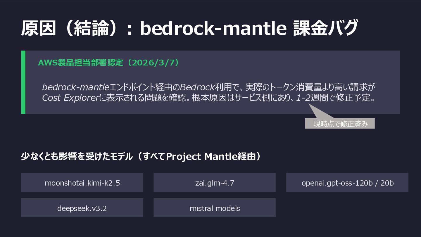 原因(結論): bedrock-mantle 課金バグ AWS製品担当部署認定(2026/3/7) bedrock-mantleエンドポイント経由のBedrock利用で、実際のトークン消費量より高い請求が Cost Explorerに表示される問題を確認。根本原因はサービス側にあり、1-2週間で修正予定。 少なくとも影響を受けたモデル(すべてProject Mantle経由) moonshotai.kimi-k2.5