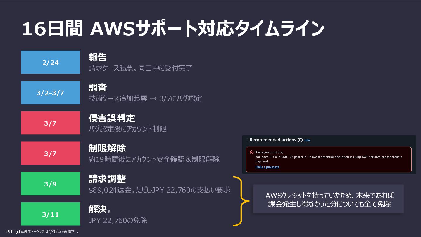 3/7 侵害誤判定 バグ認定後にアカウント制限 3/7 制限解除 約19時間後にアカウント安全確認&制限解除 3/9 請求調整 $89,024返金。ただしJPY 22,760の支払い要求 3/11 解決 ※ JPY 22,760の免除 AWSクレジットを持っていたため、本来であれば 課金発生し得なかった分についても全て免除 ※Billing上の表示トークン数は4/4時点で未修正...