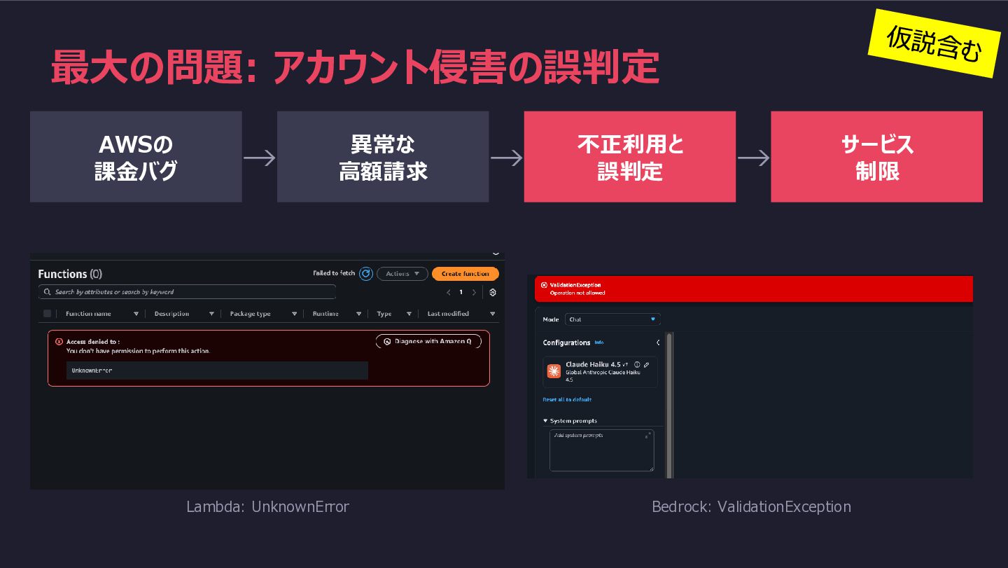 最大の問題: アカウント侵害の誤判定 AWSの 課金バグ → 異常な 高額請求 → 不正利用と 誤判定