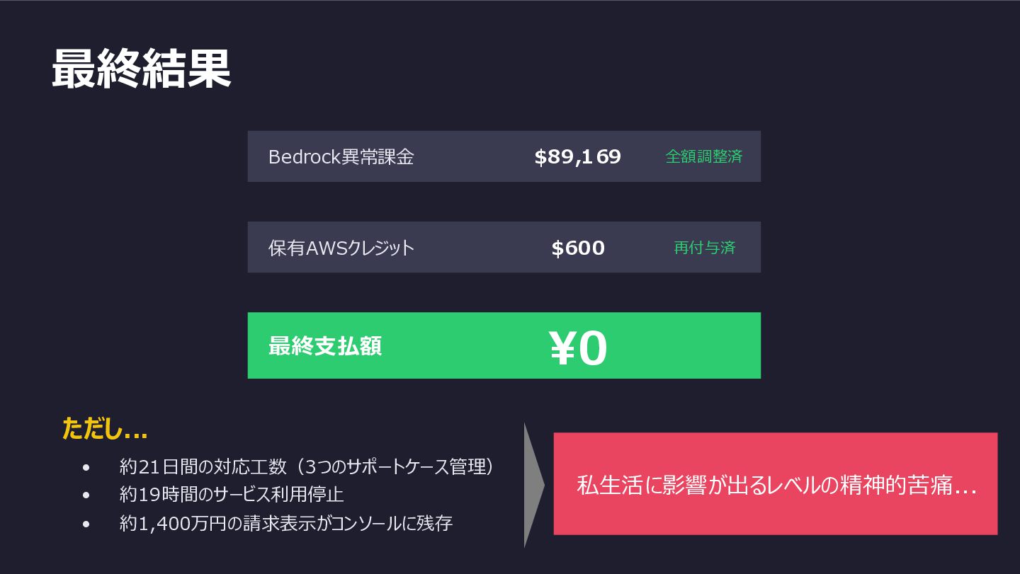 最終結果 Bedrock異常課金 $89,169 全額調整済 保有AWSクレジット $600 再付与済 最終支払額 ¥0 ただし...
