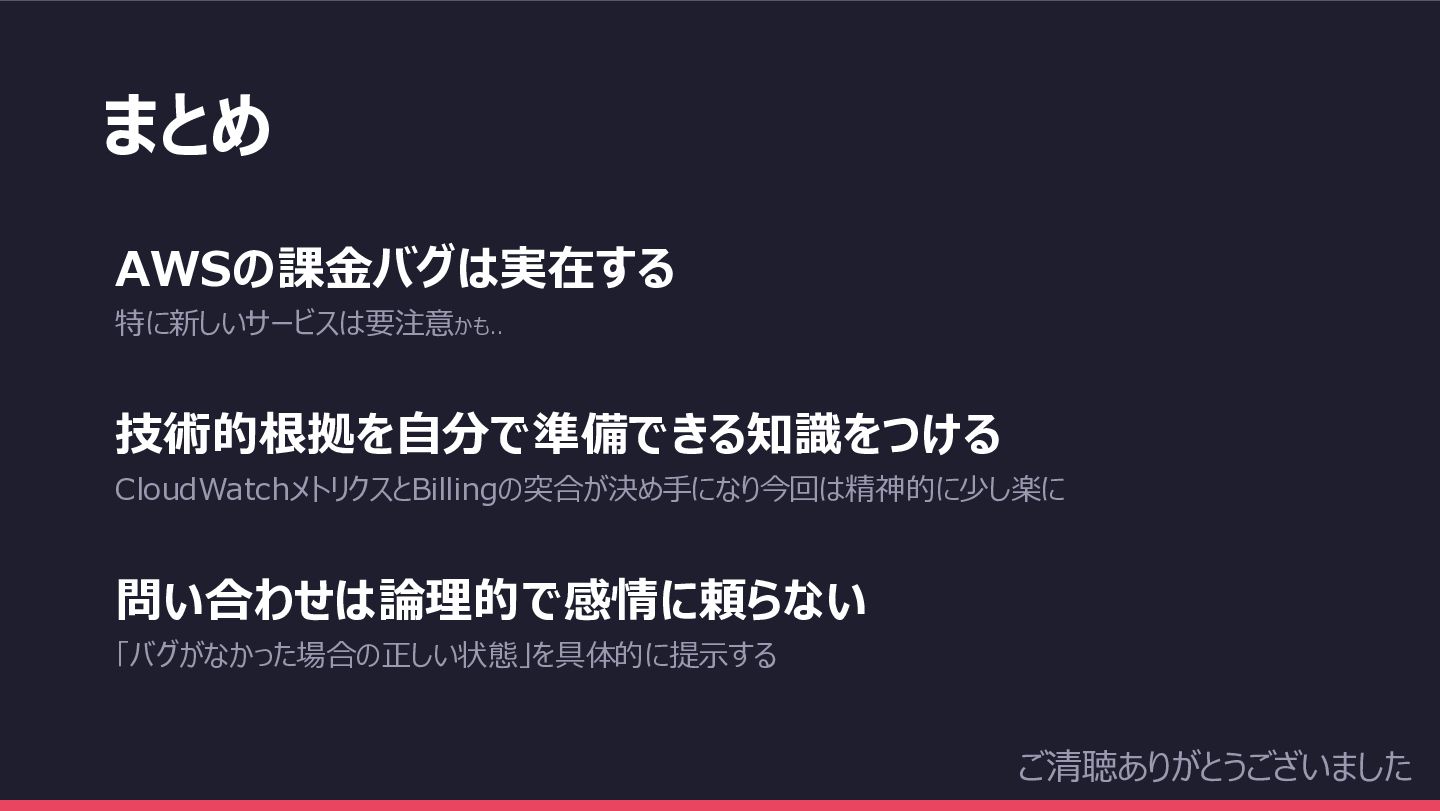 まとめ AWSの課金バグは実在する 特に新しいサービスは要注意かも.. 技術的根拠を自分で準備できる知識をつける CloudWatchメトリクスとBillingの突合が決め手になり今回は精神的に少し楽に 問い合わせは論理的で感情に頼らない 「バグがなかった場合の正しい状態」を具体的に提示する ご清聴ありがとうございました