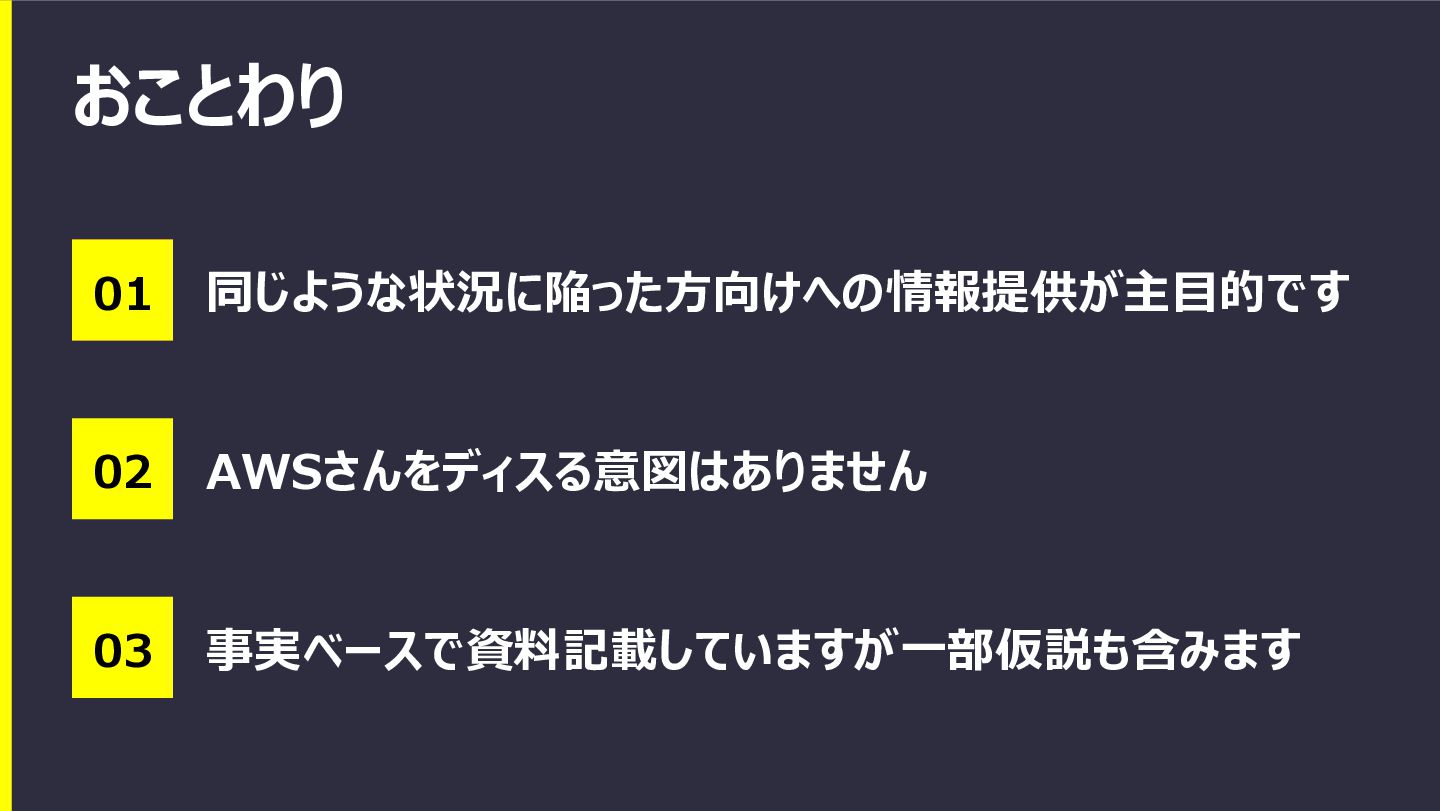 おことわり 01 同じような状況に陥った方向けへの情報提供が主目的です 02 AWSさんをディスる意図はありません 03 事実ベースで資料記載していますが一部仮説も含みます