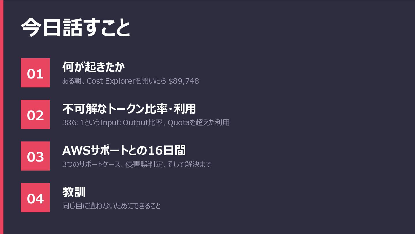 今日話すこと 01 何が起きたか ある朝、Cost Explorerを開いたら $89,748 02 不可解なトークン比率・利用 386:1というInput:Output比率、Quotaを超えた利用 03