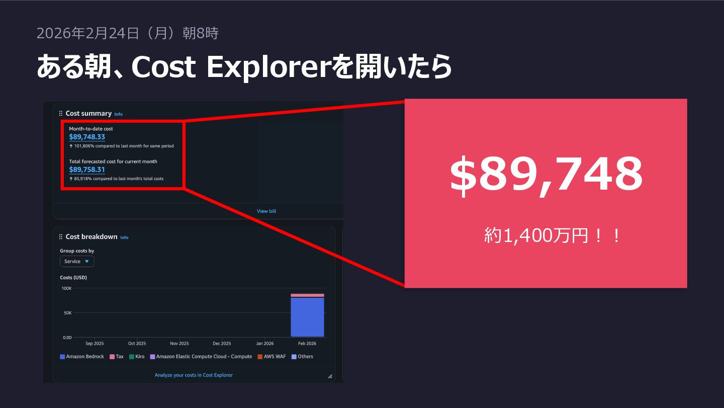 2026年2月24日(月)朝8時 ある朝、Cost Explorerを開いたら $89,748 約1,400万円!!