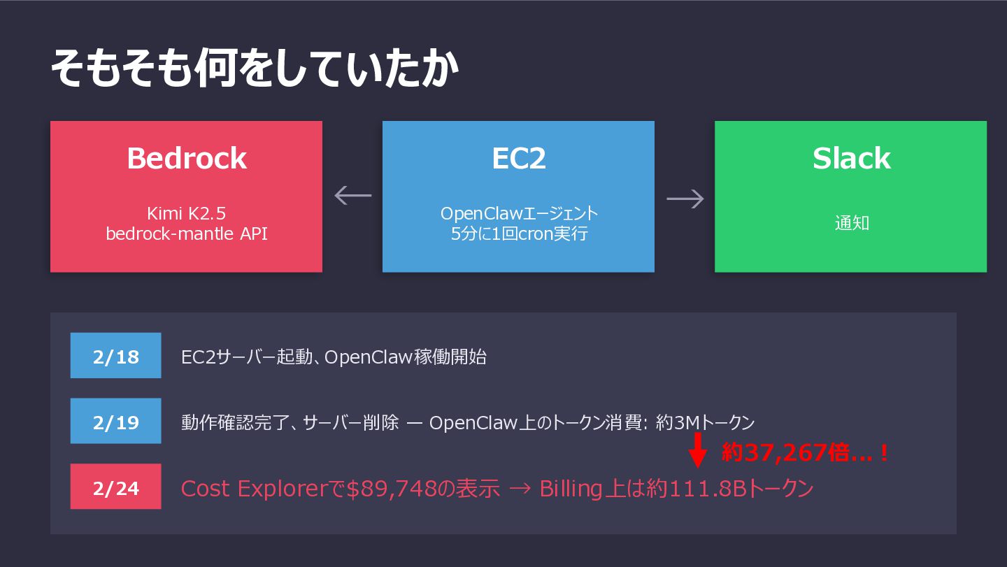 → Slack 通知 2/18 EC2サーバー起動、OpenClaw稼働開始 2/19 動作確認完了、サーバー削除 — OpenClaw上のトークン消費: 約3Mトークン 2/24 Cost Explorerで$89,748の表示 → Billing上は約111.8Bトークン 約37,267倍...!