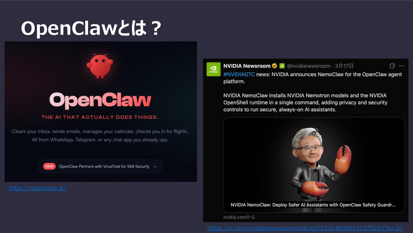 https://openclaw.ai/ https://x.com/nvidianewsroom/status/2033640956512375262?s=20 OpenClawとは?