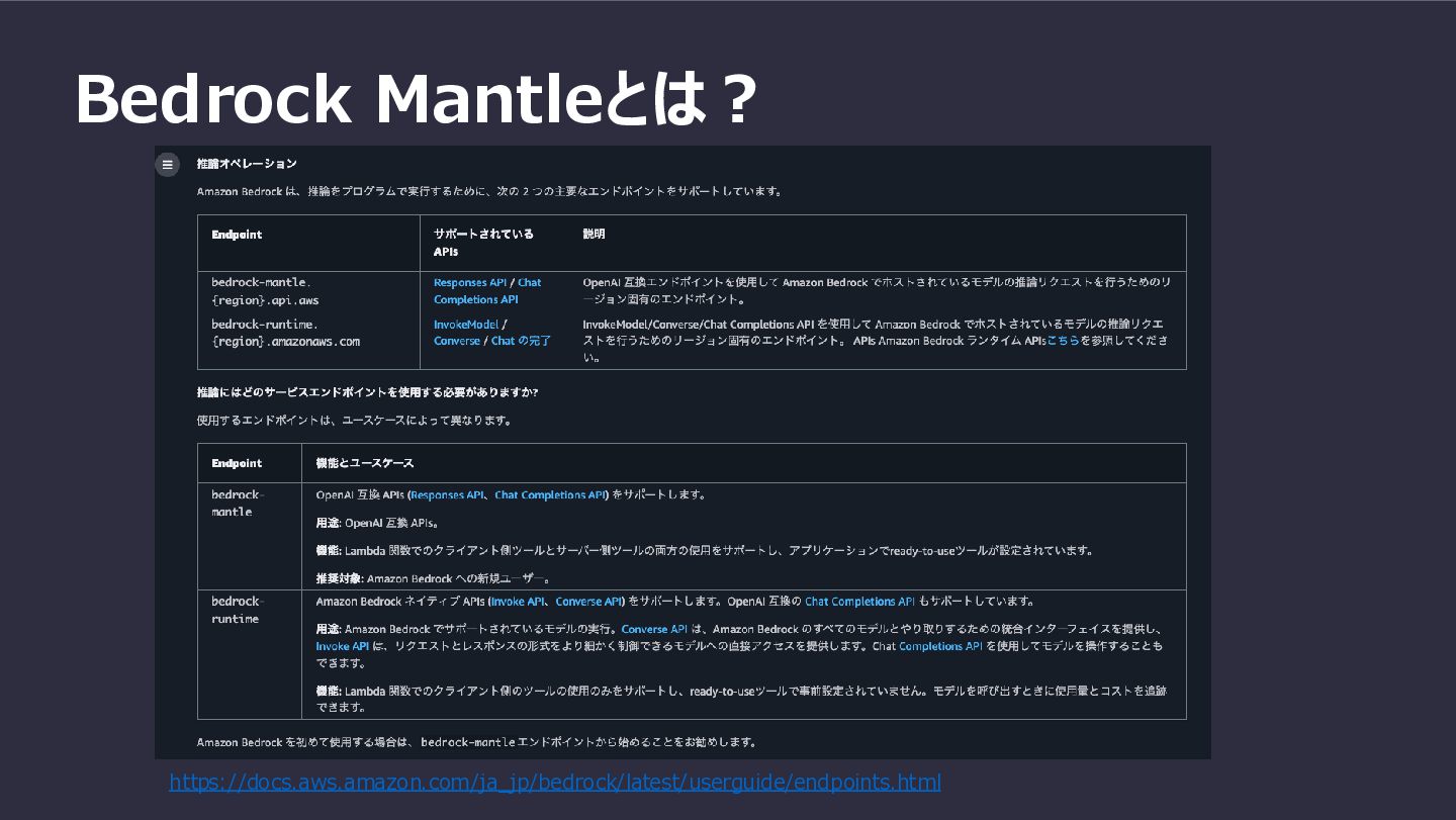 Bedrock Mantleとは? https://docs.aws.amazon.com/ja_jp/bedrock/latest/userguide/endpoints.html