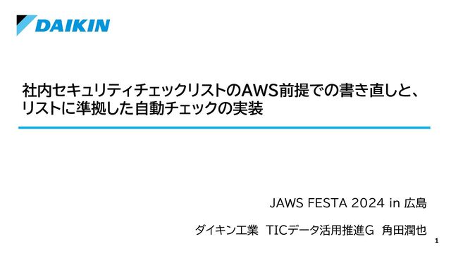 社内セキュリティチェックリストのAWS前提での書き直しと、 リストに準拠した自動チェックの実装 1 JAWS FESTA 2024 in 広島 ダイキン工業 TICデータ活用推進G