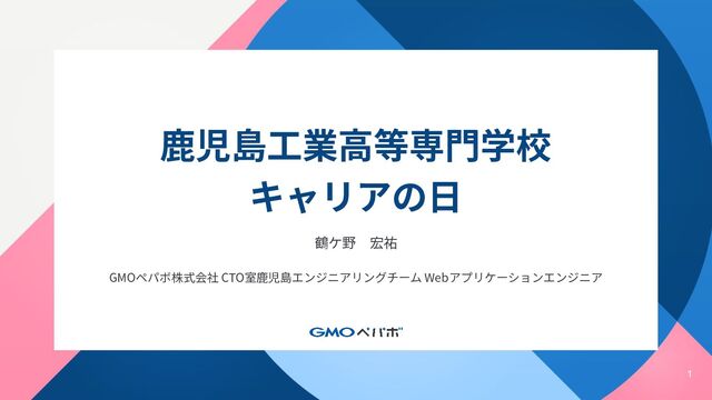 1 ⿅児島⼯業⾼等専⾨学校 キャリアの⽇ 鶴ケ野 宏祐 GMOペパボ株式会社 CTO室⿅児島エンジニアリングチーム Webアプリケーションエンジニア