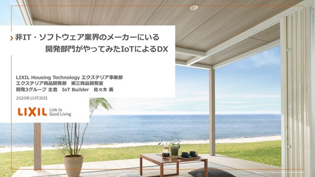 LIXIL Housing Technology エクステリア事業部 エクステリア商品開発部 第三商品開発室 開発3グループ 主査 IoT Builder 佐々⽊ 義 2020年10⽉30⽇