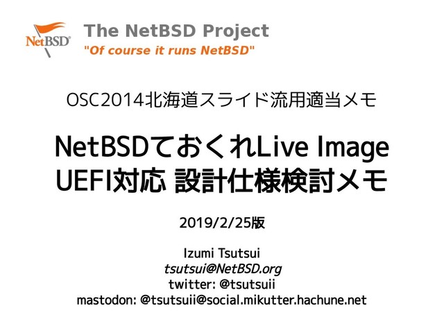 https://github.com/tsutsui/netbsd-teokureliveimage/issues/12 OSC2014北海道セミナー NetBSDておくれ Live Imageの紹介と解説 https://speakerdeck.com/tsutsui/osc2014do-netbsd-teokure-liveimage NetBSD Wiki / Installation on UEFI systems https://wiki.netbsd.org/Installation_on_UEFI_systems/