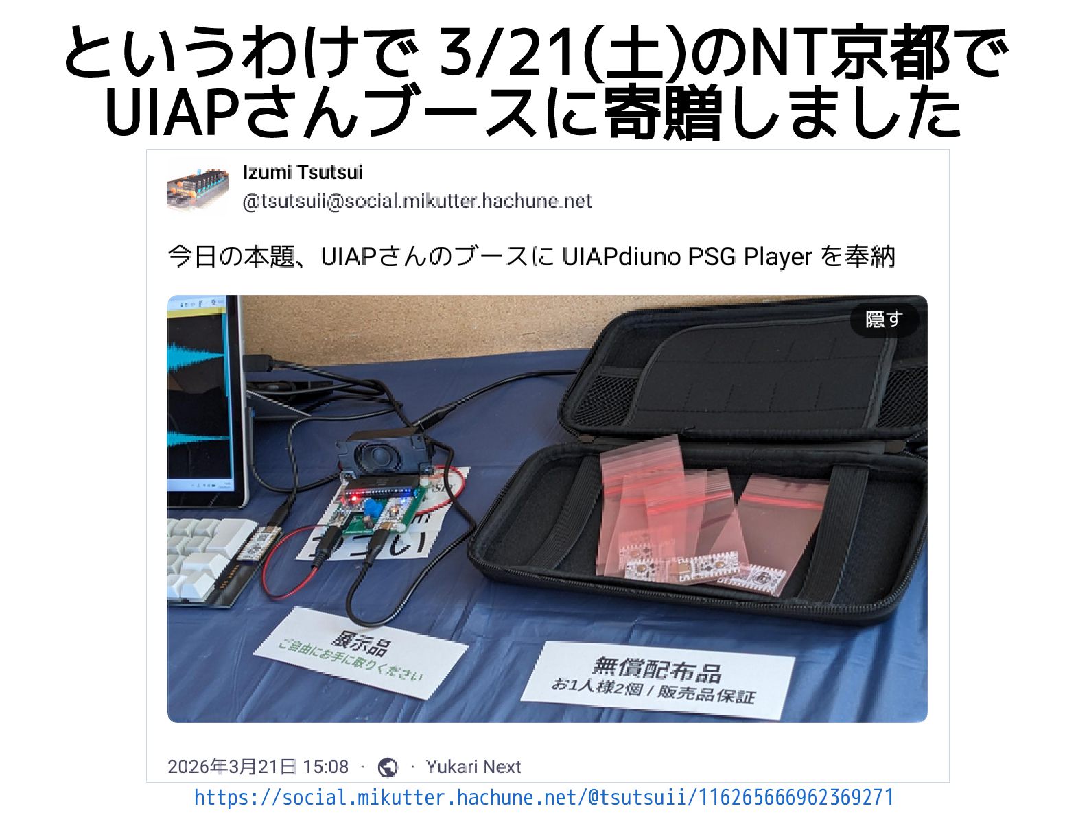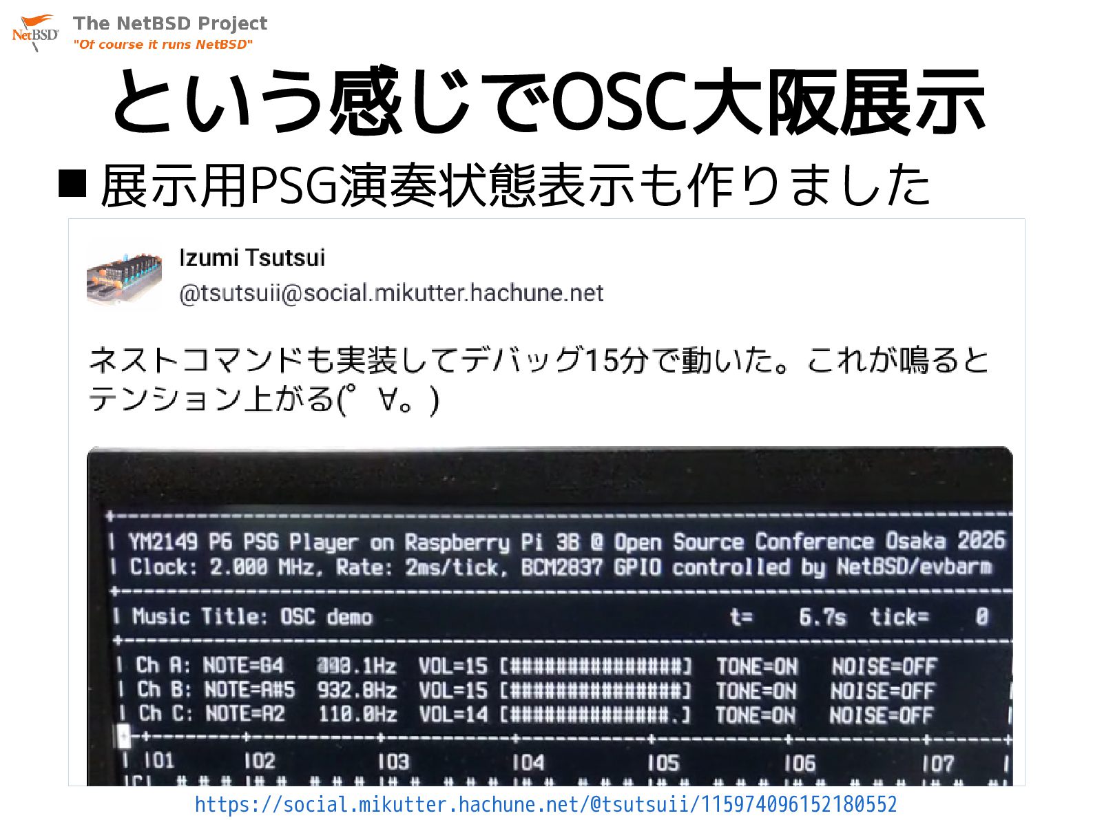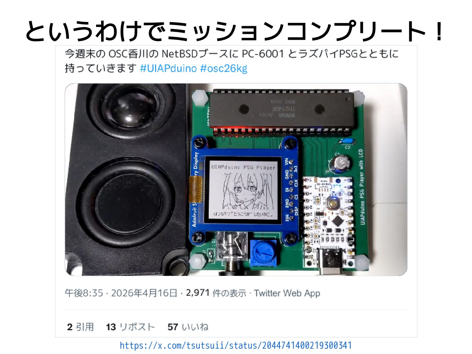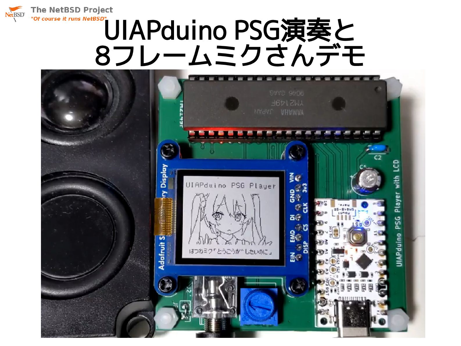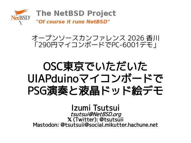 オープンソースカンファレンス 2026 Kagawa の「NetBSDのご紹介」のセミナーで発表した『OSC東京でいただいた UIAPduinoマイコンボードで PSG演奏と液晶ドッド絵デモ』のスライドです。(セミナー発表時から一部誤記の修正をしています)