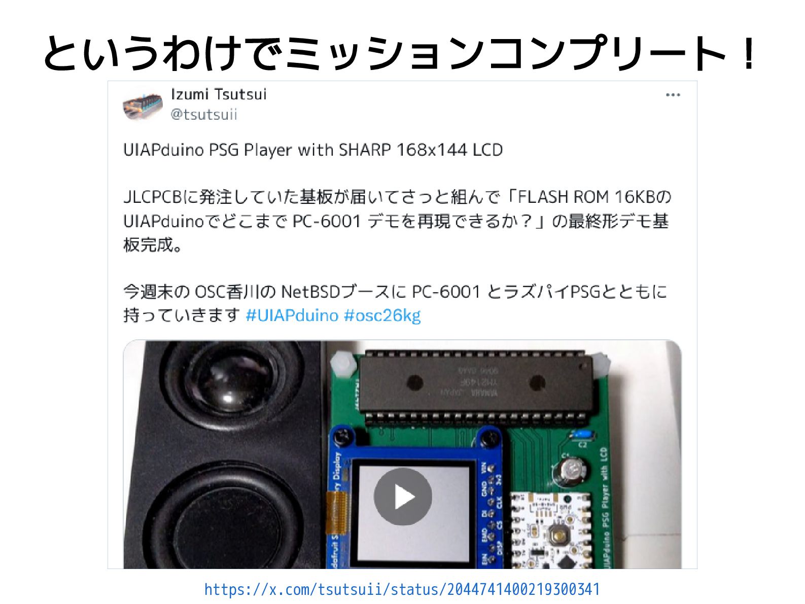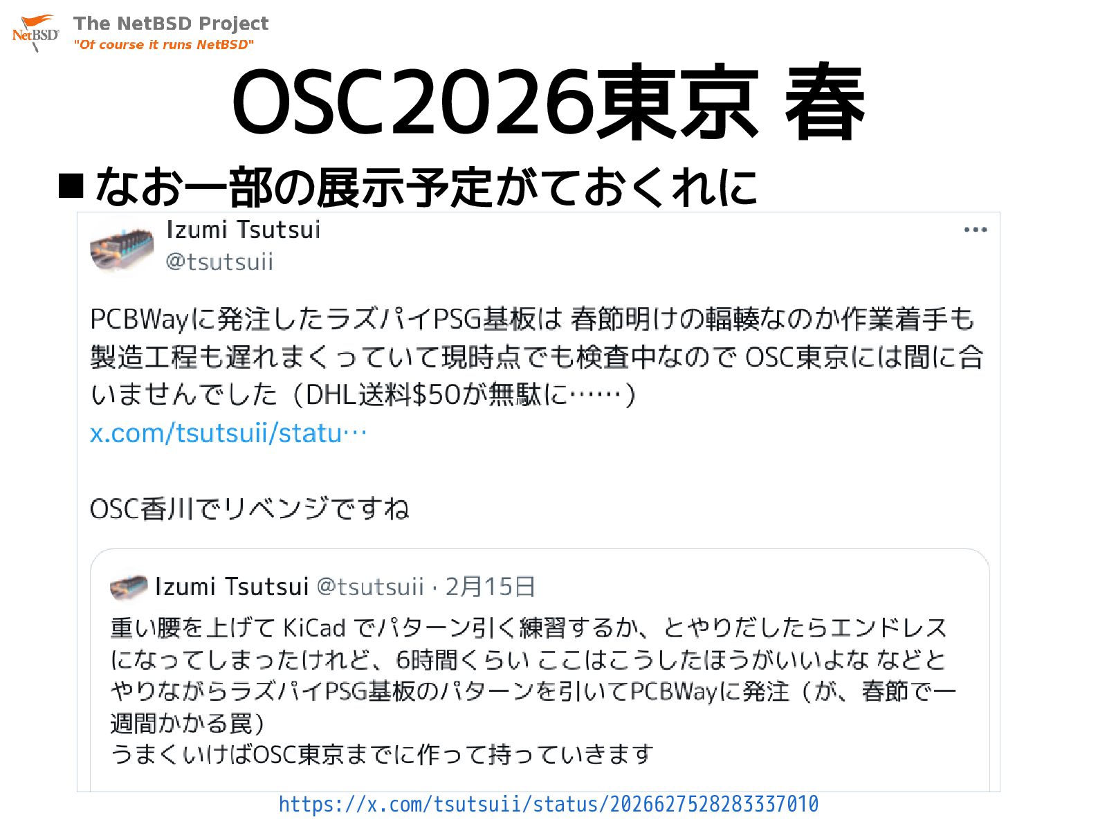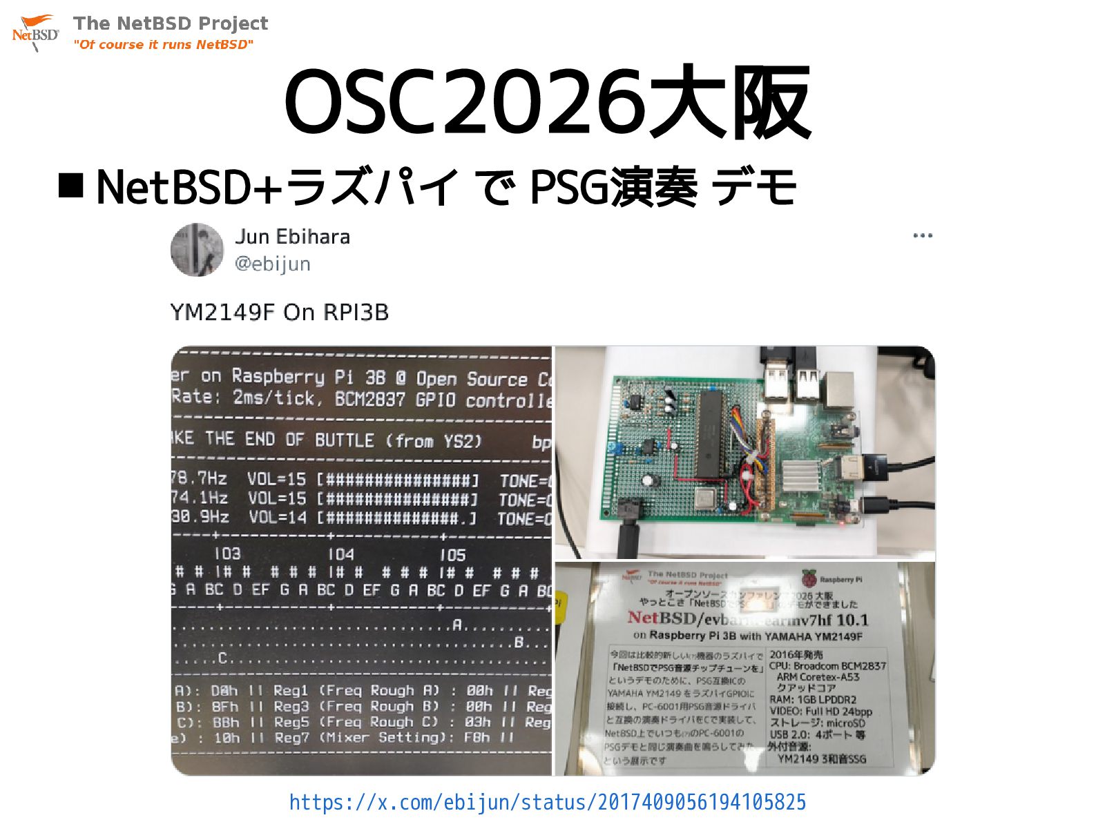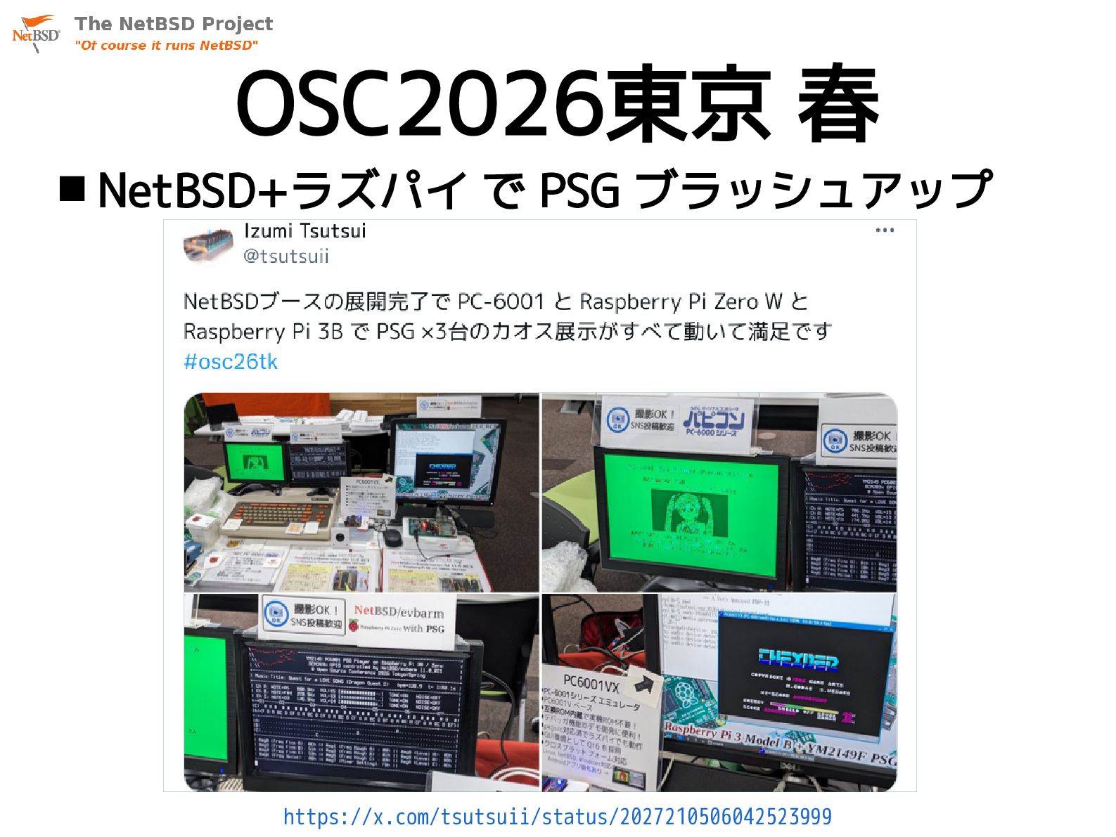 オープンソースカンファレンス 2026 Kagawa の「NetBSDのご紹介」のセミナーで発表した『OSC東京でいただいた UIAPduinoマイコンボードで PSG演奏と液晶ドッド絵デモ』のスライドです。(セミナー発表時から一部誤記の修正をしています)