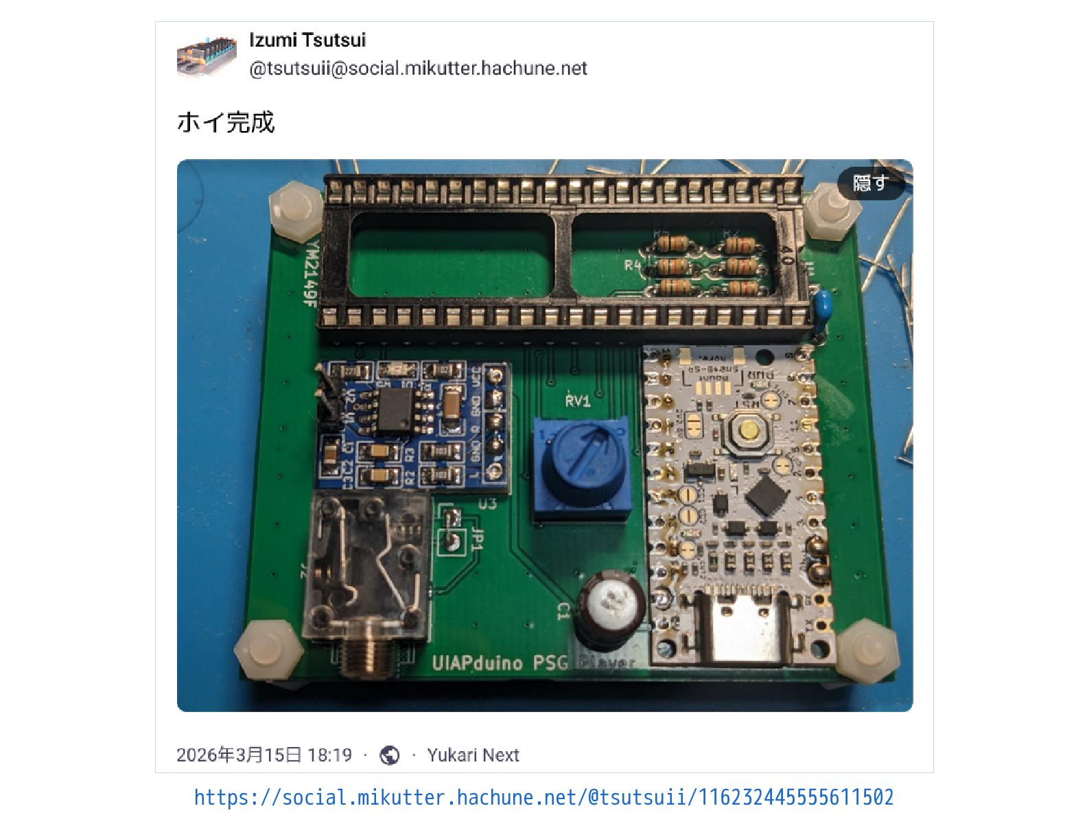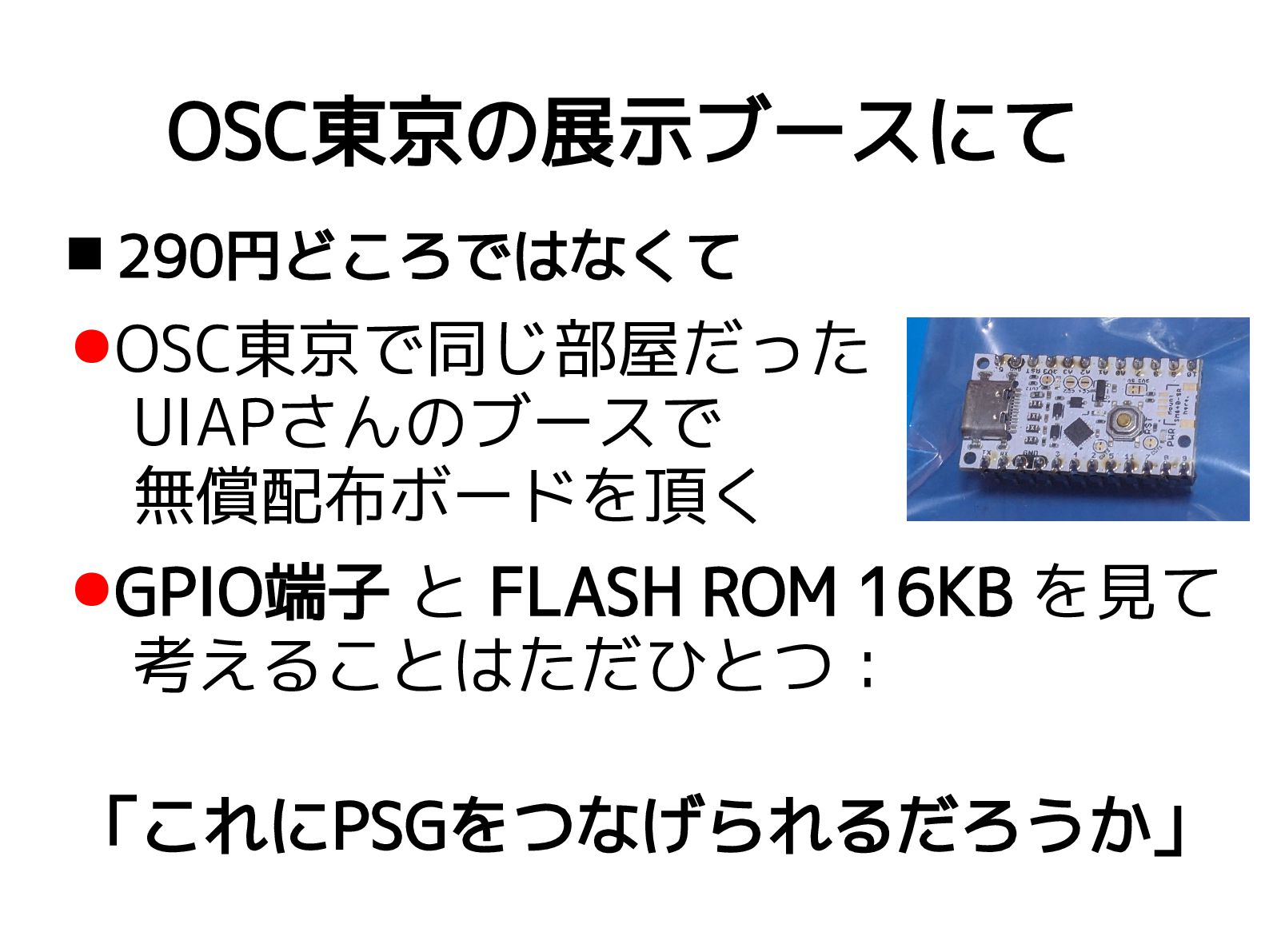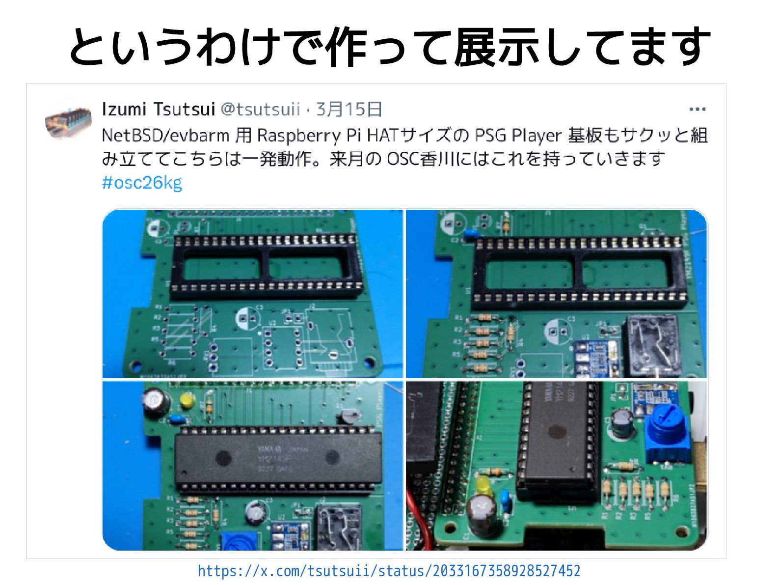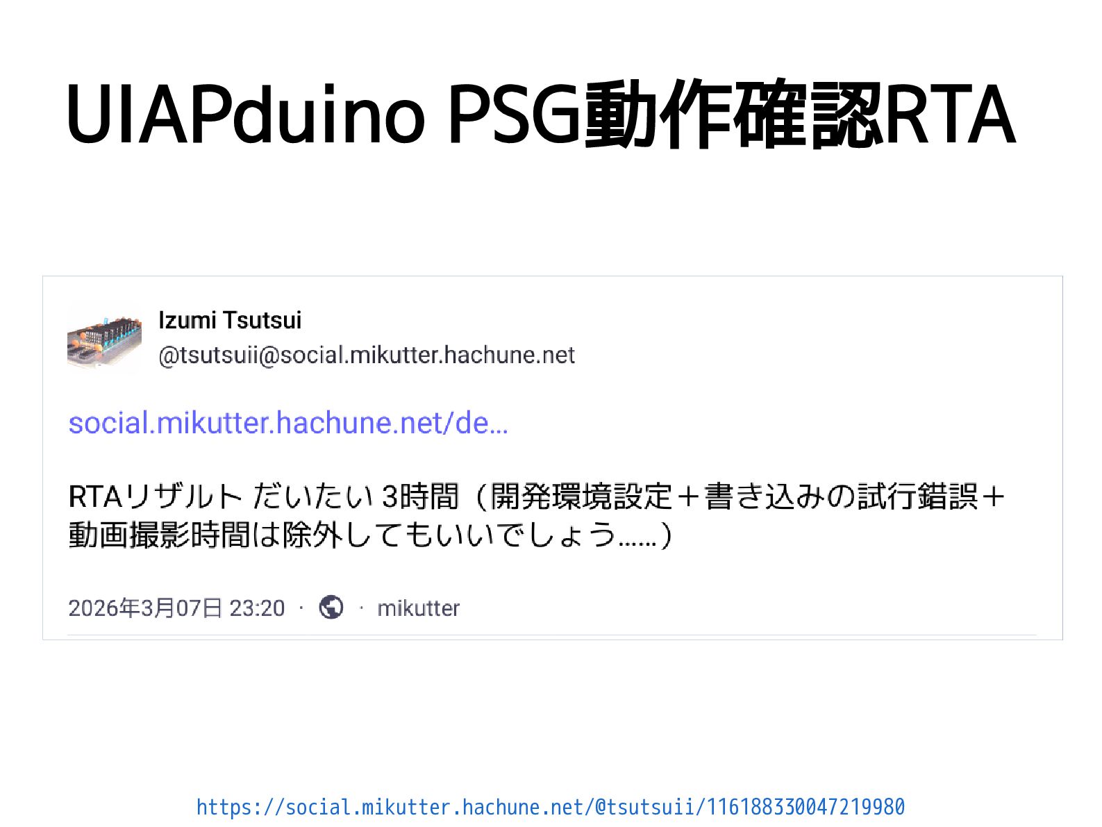 オープンソースカンファレンス 2026 Kagawa の「NetBSDのご紹介」のセミナーで発表した『OSC東京でいただいた UIAPduinoマイコンボードで PSG演奏と液晶ドッド絵デモ』のスライドです。(セミナー発表時から一部誤記の修正をしています)