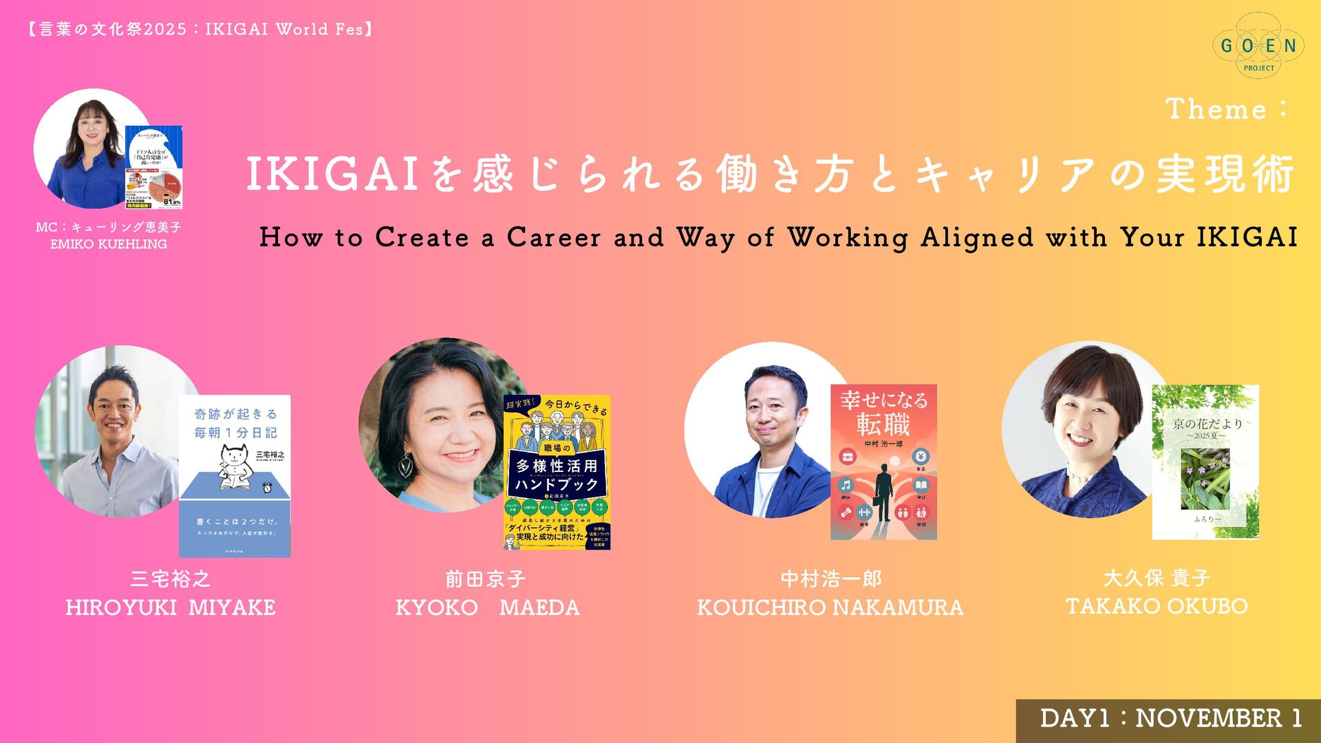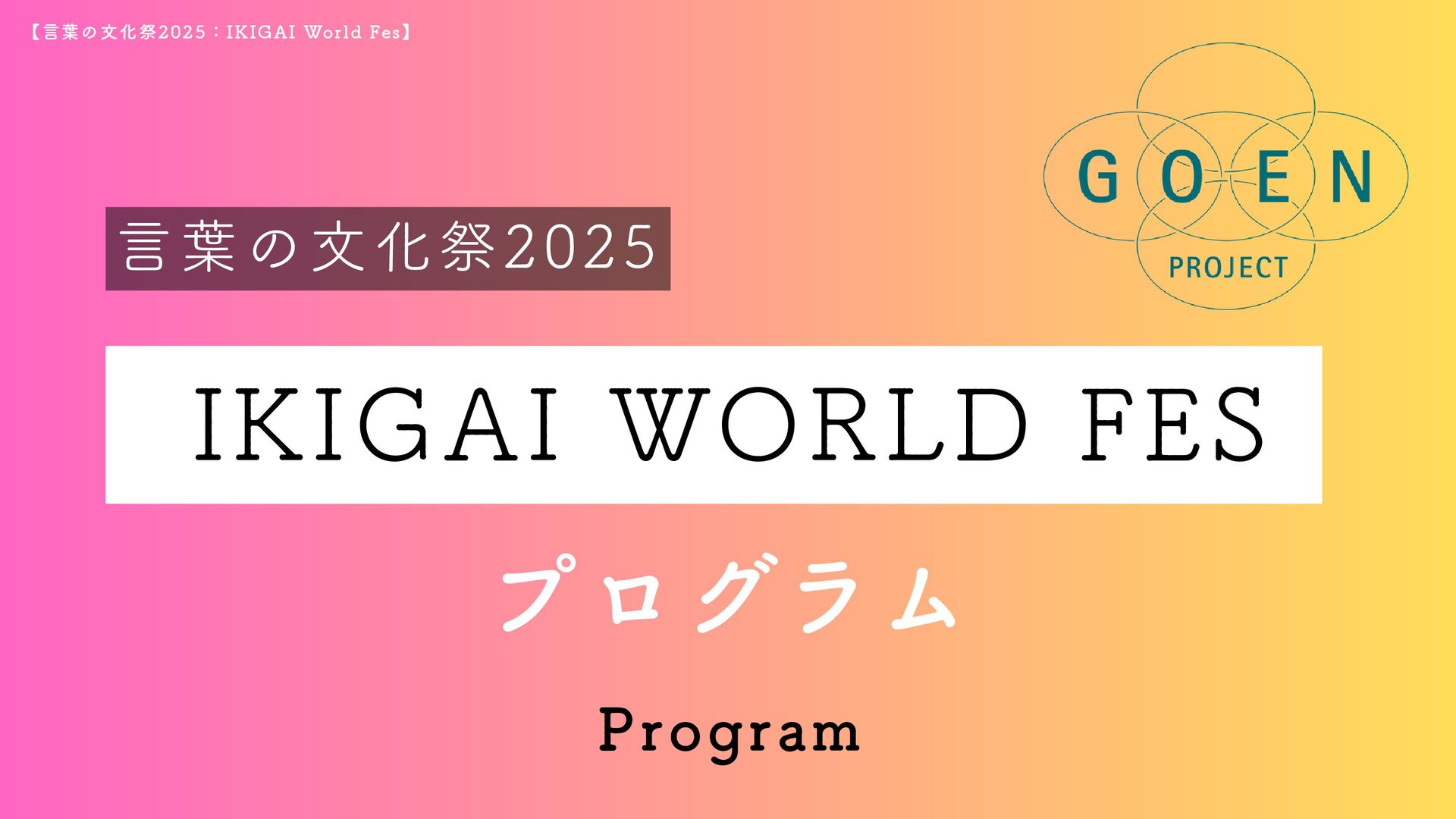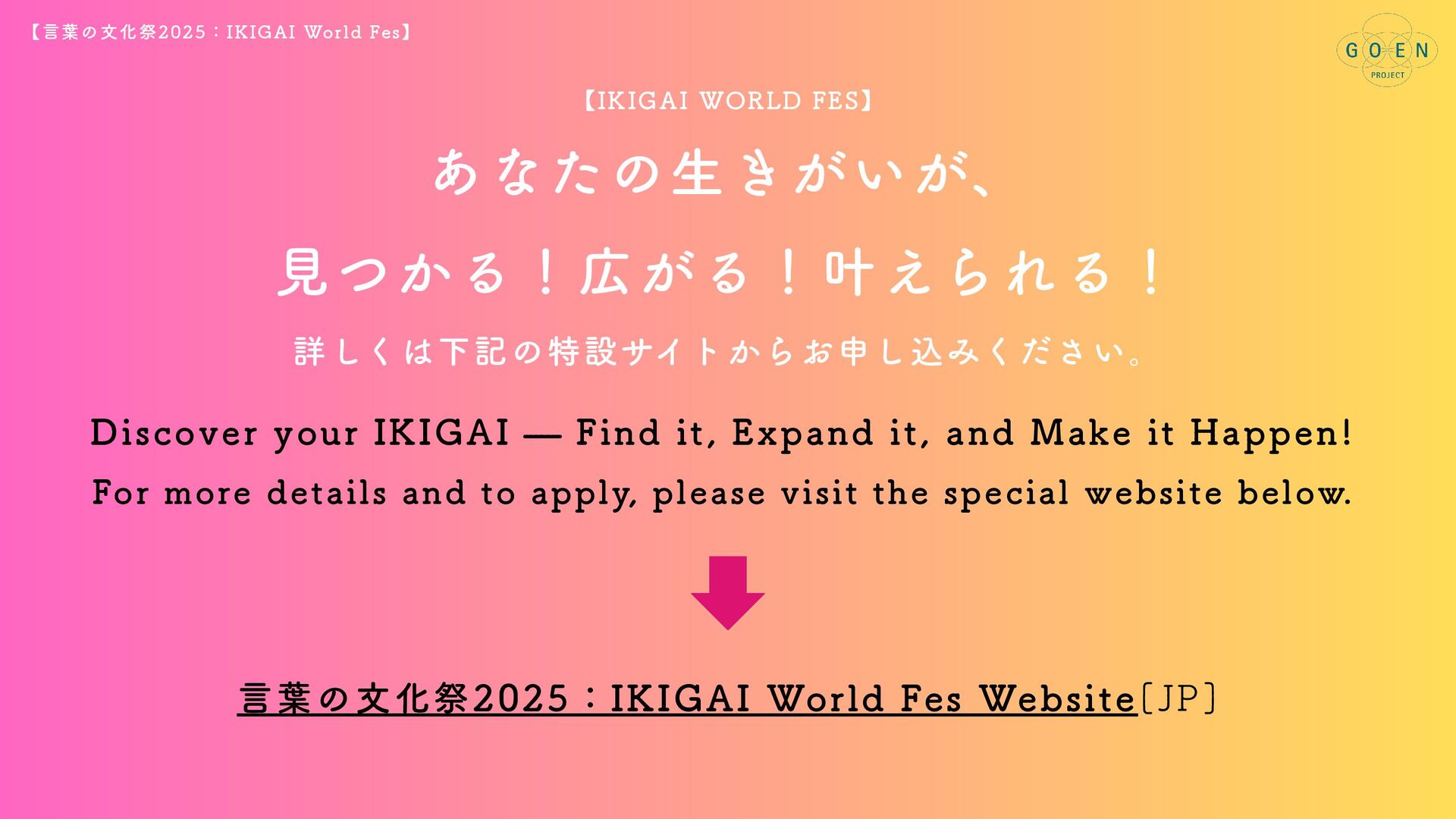your IKIGAI — Find it, Expand it, and Make it Happen! For more details and to apply, please visit the special website below. 言葉の文化祭2025:IKIGAI World Fes Website[JP]