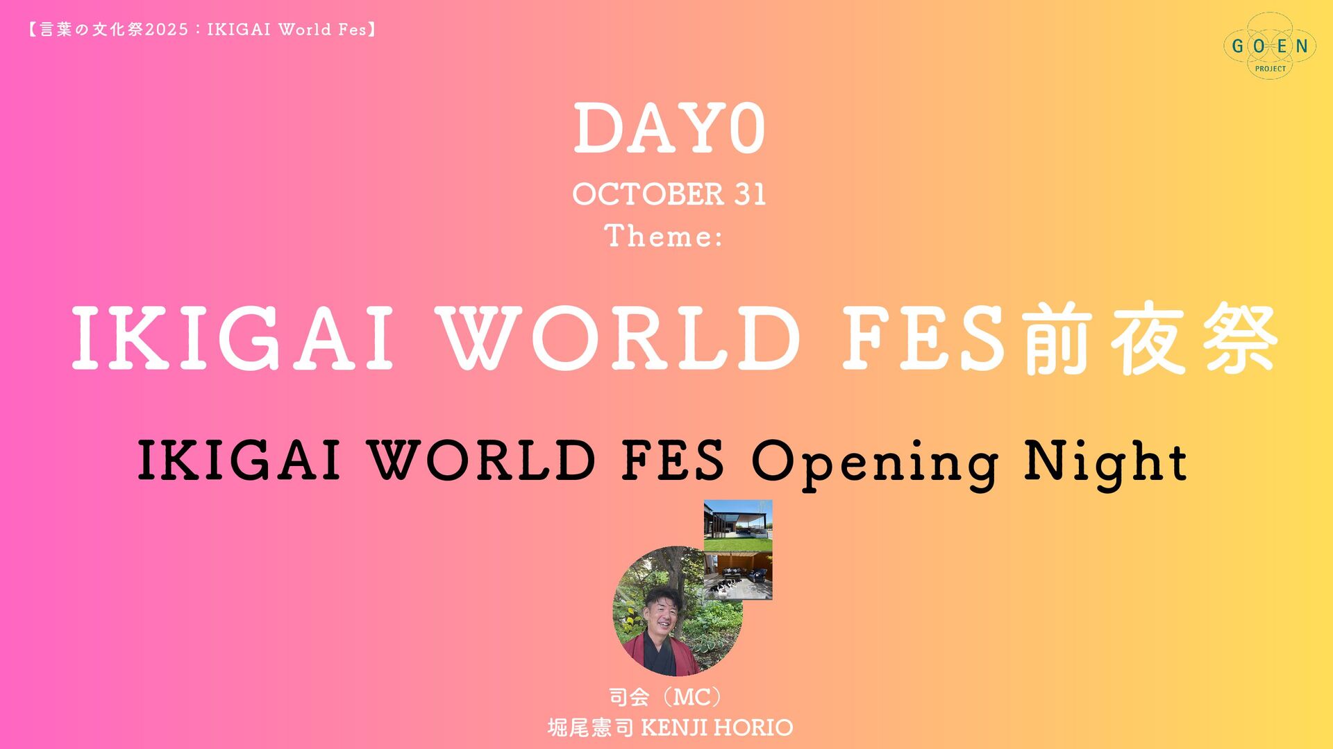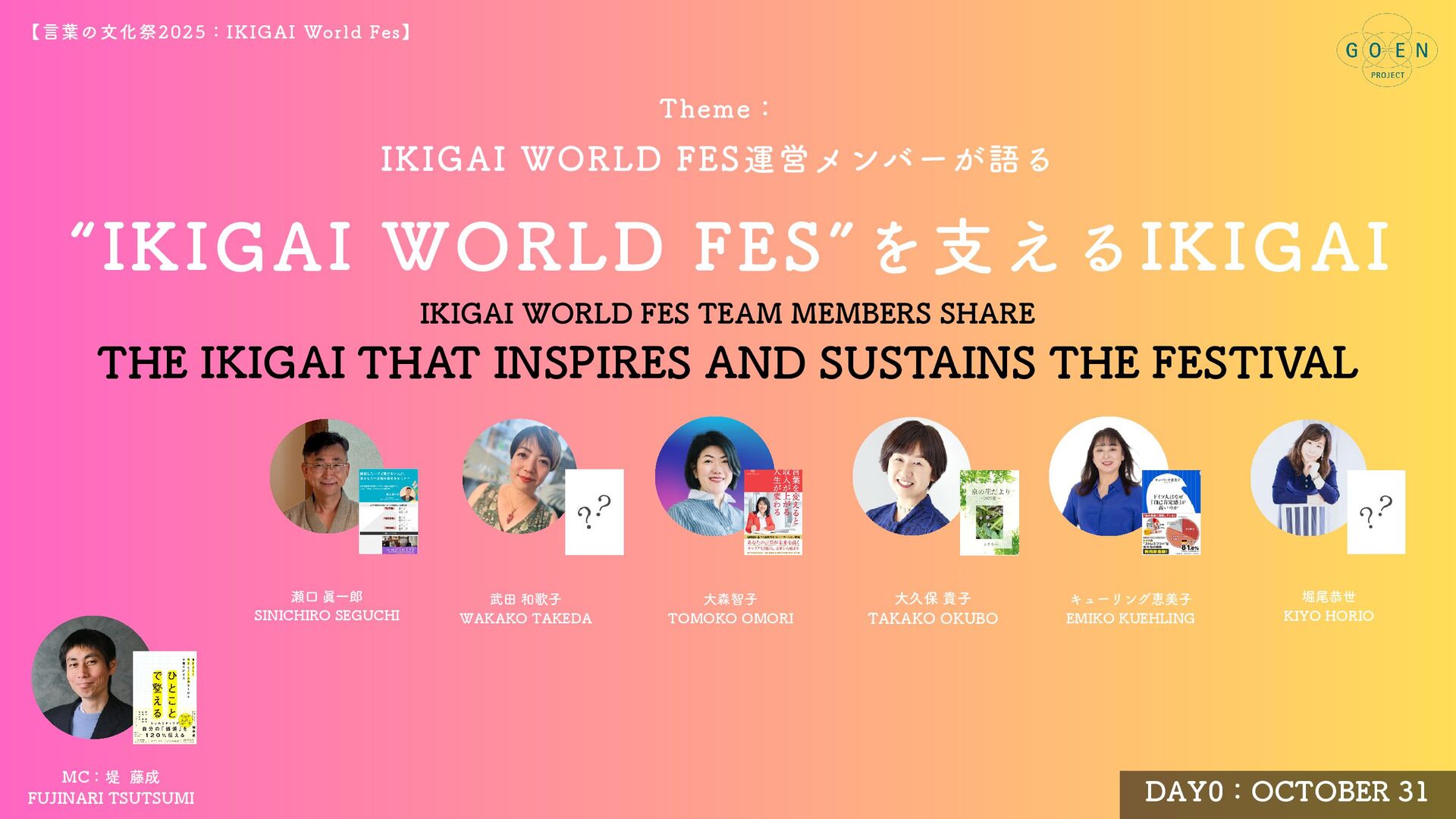 TSUTSUMI 瀬口 眞一郎 SINICHIRO SEGUCHI 武田 和歌子 WAKAKO TAKEDA 大森智子 TOMOKO OMORI キューリング恵美子 EMIKO KUEHLING 大久保 貴子 TAKAKO OKUBO DAY0:OCTOBER 31 【言葉の文化祭2025:IKIGAI World Fes】 IKIGAI WORLD FES TEAM MEMBERS SHARE THE IKIGAI THAT INSPIRES AND SUSTAINS THE FESTIVAL 堀尾恭世 KIYO HORIO