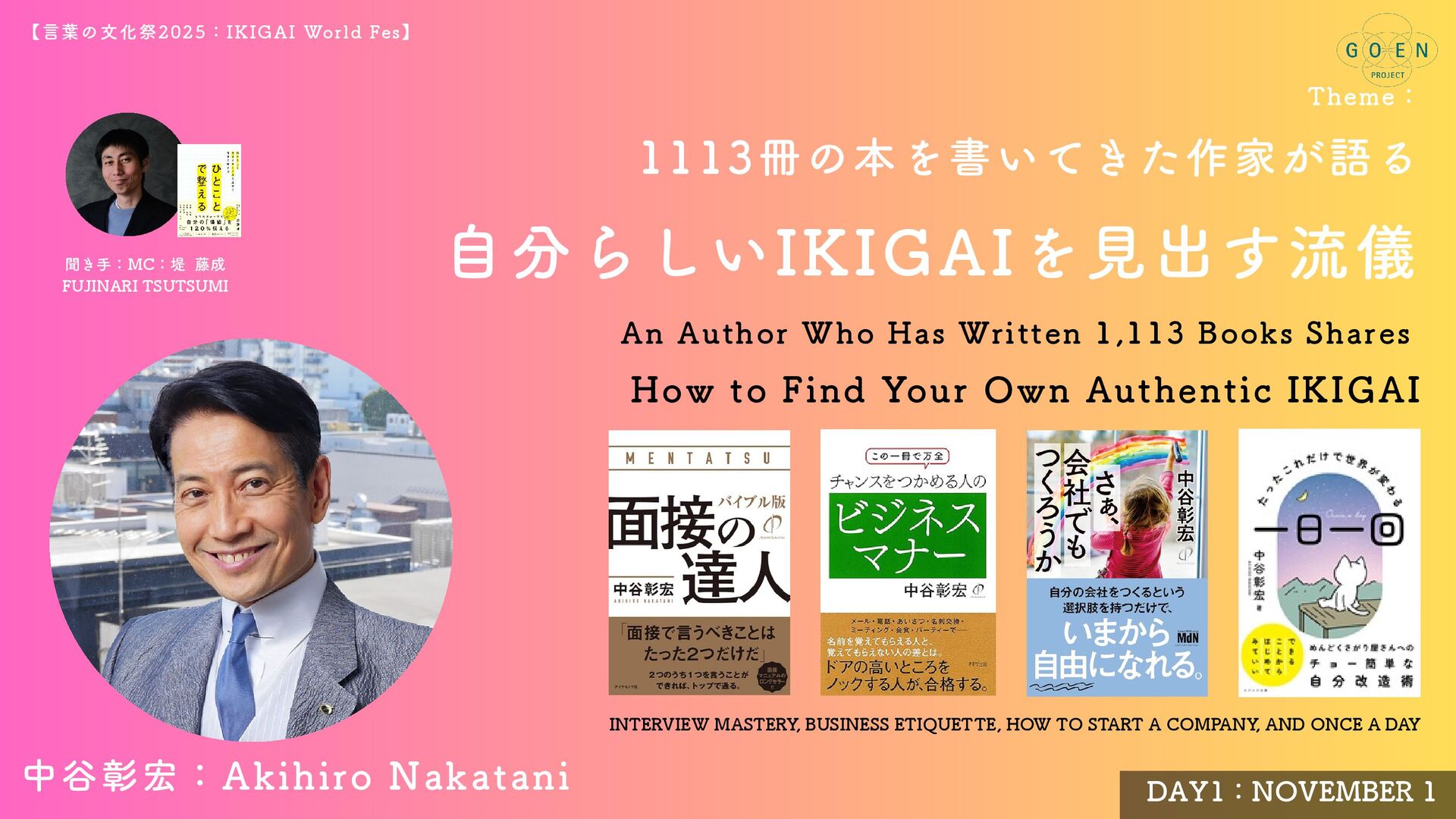 Shares How to Find Your Own Authentic IKIGAI 中谷彰宏:Akihiro Nakatani DAY1:NOVEMBER 1 【言葉の文化祭2025:IKIGAI World Fes】 聞き手:MC:堤 藤成 FUJINARI TSUTSUMI INTERVIEW MASTERY , BUSINESS ETIQUETTE, HOW TO START A COMPANY , AND ONCE A DAY