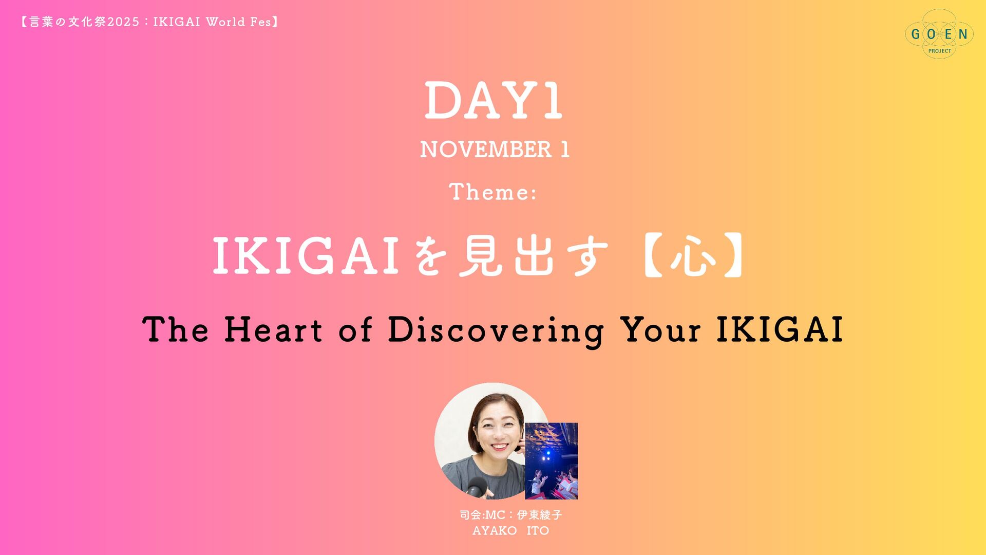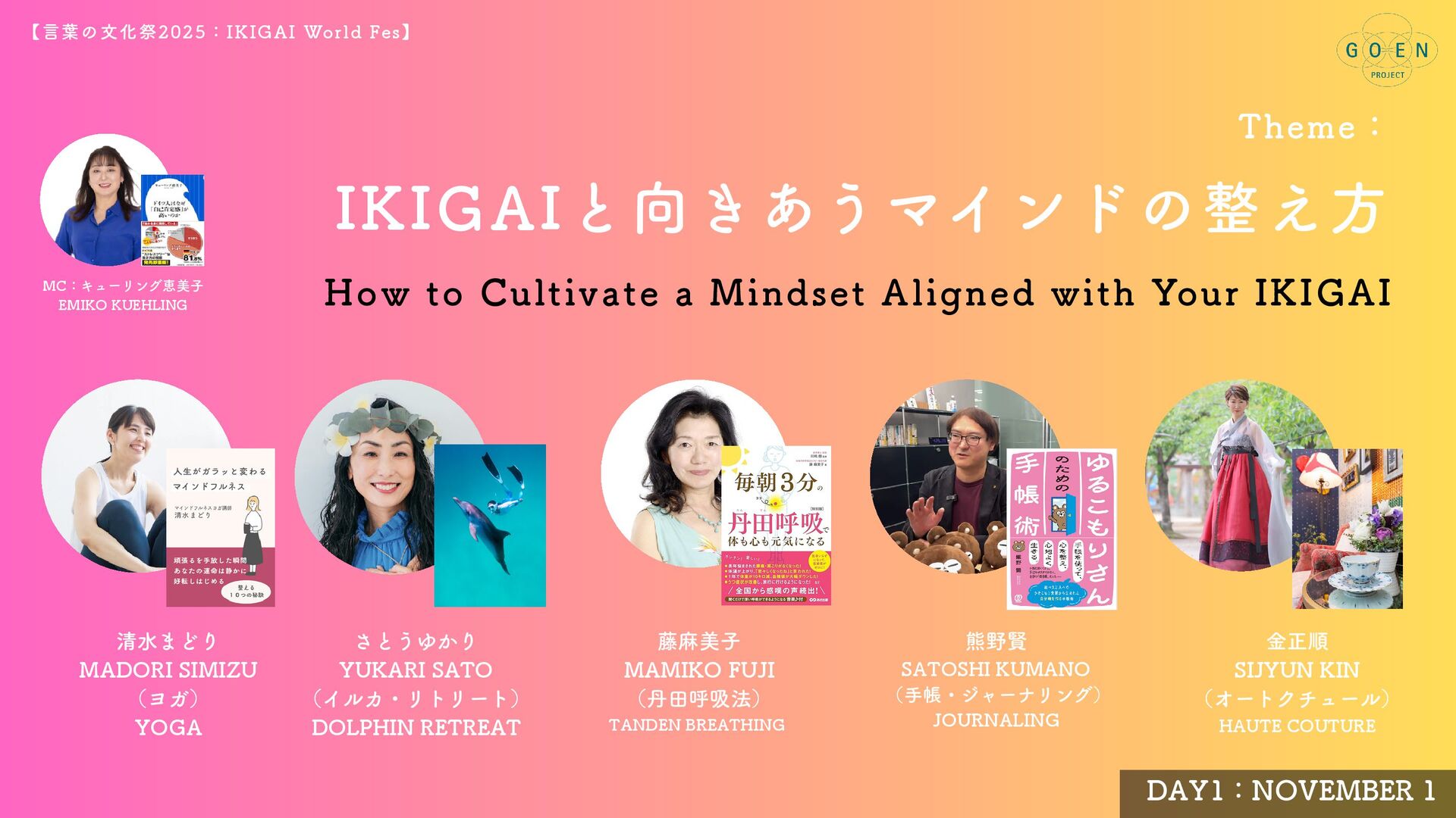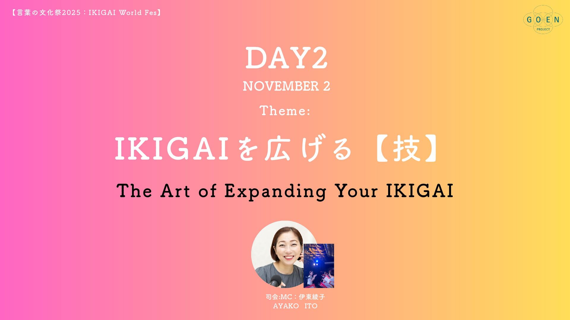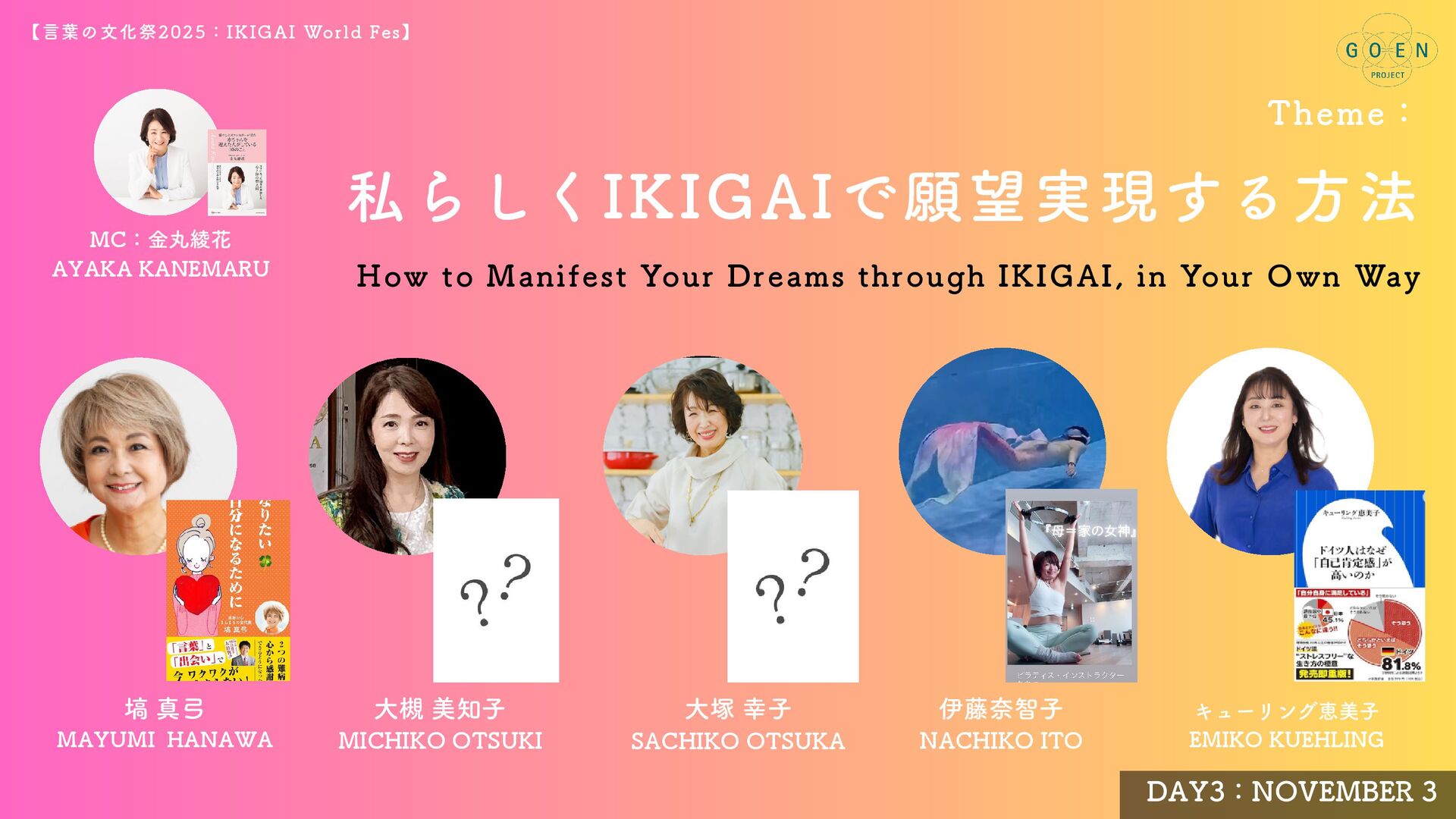 through IKIGAI, in Your Own Way 塙 真弓 MAYUMI HANAWA 大槻 美知子 MICHIKO OTSUKI 大塚 幸子 SACHIKO OTSUKA DAY3:NOVEMBER 3 【言葉の文化祭2025:IKIGAI World Fes】 MC:金丸綾花 AYAKA KANEMARU キューリング恵美子 EMIKO KUEHLING