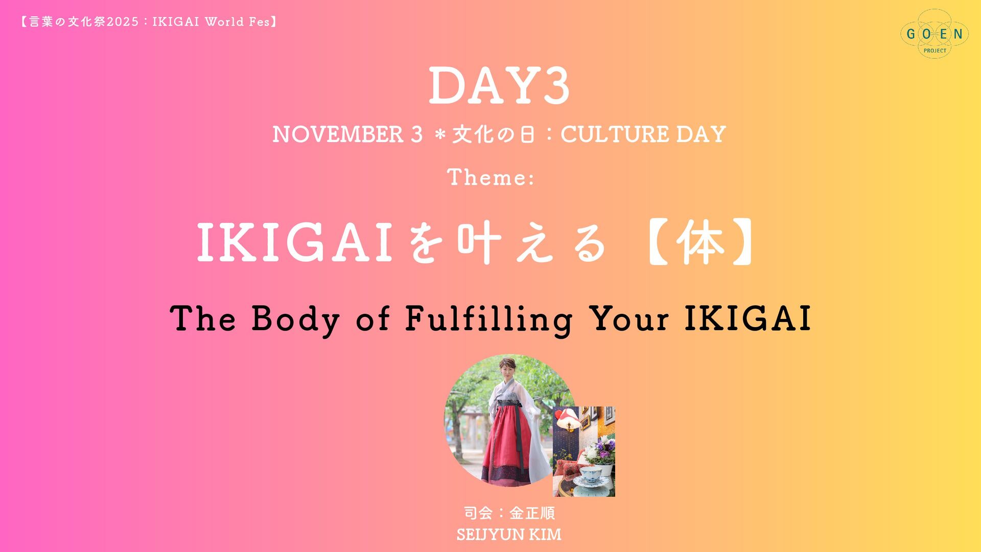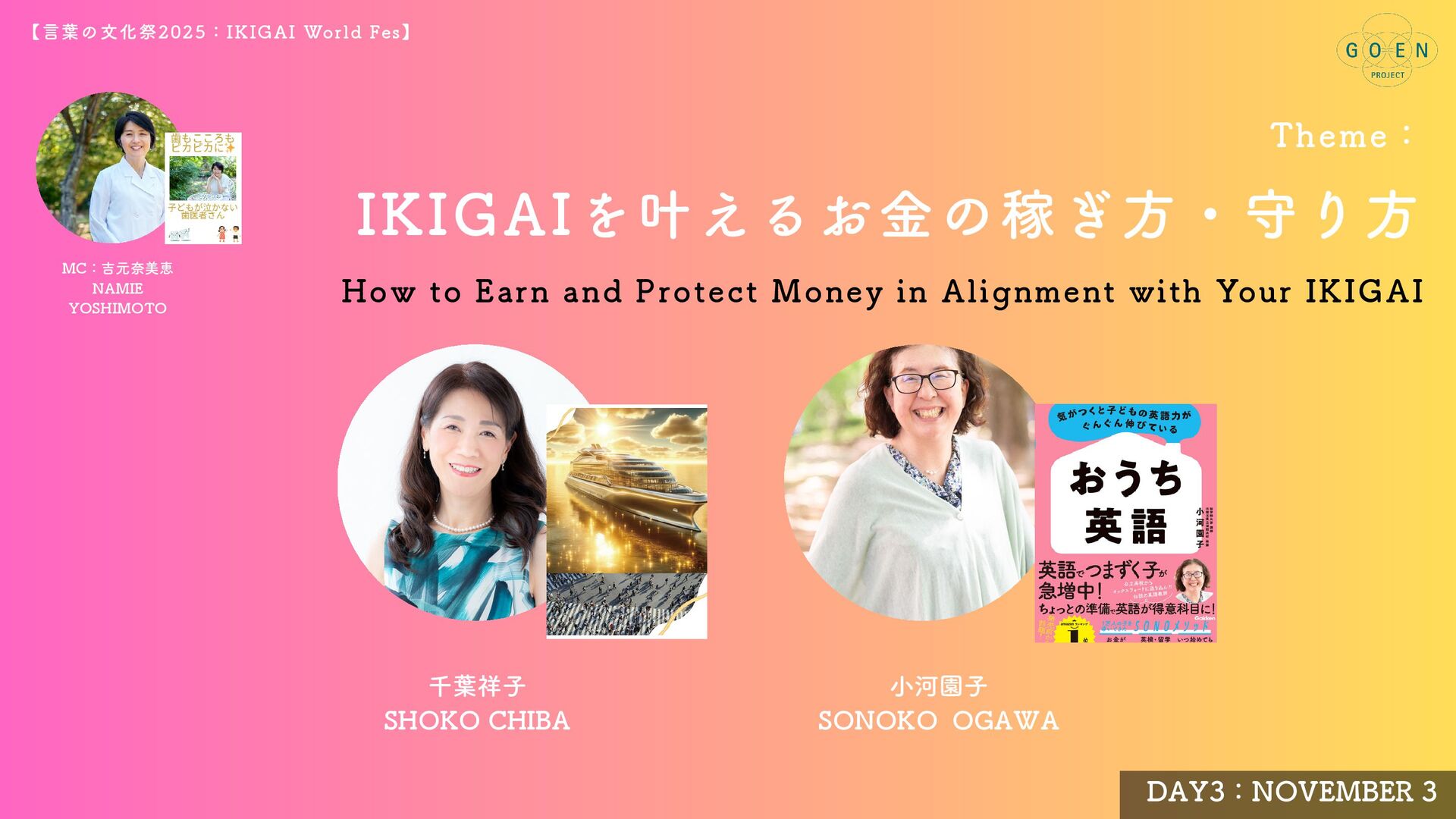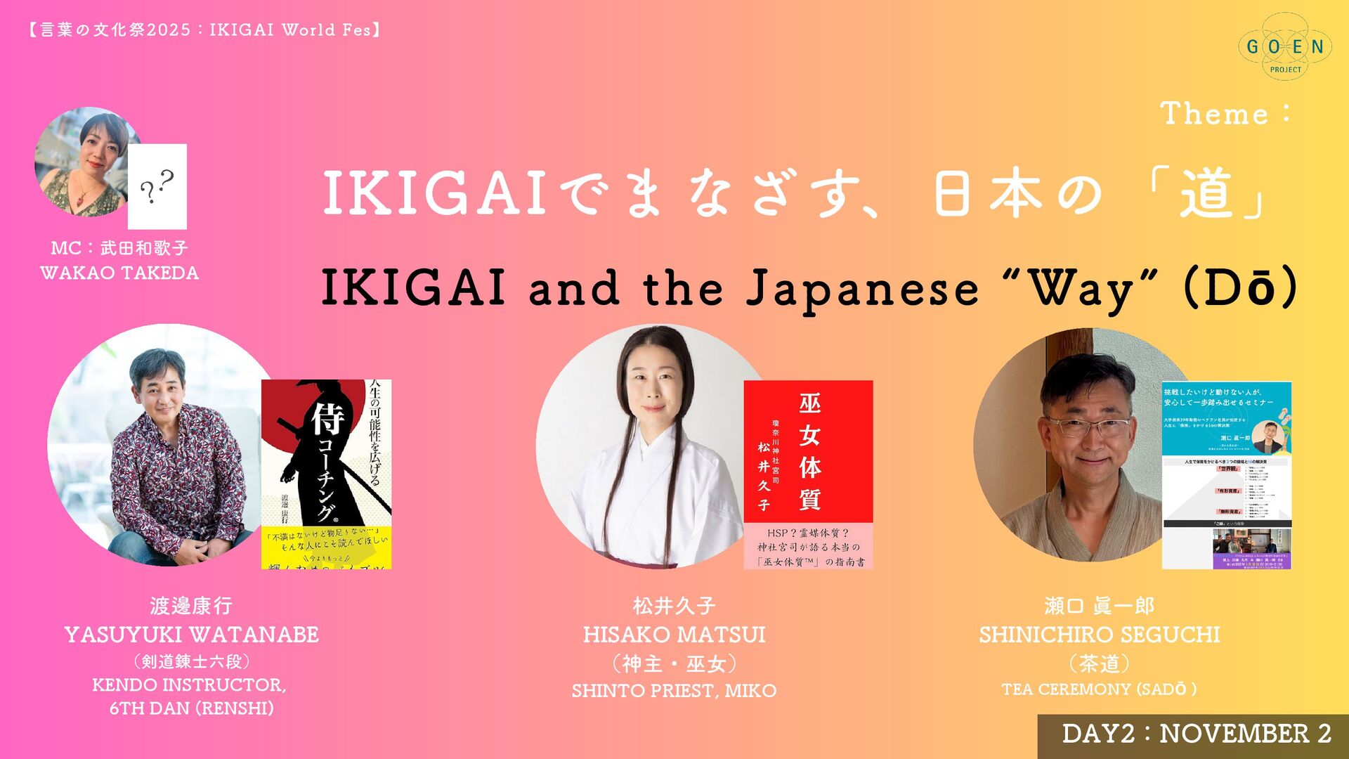 through IKIGAI, in Your Own Way 塙 真弓 MAYUMI HANAWA 大槻 美知子 MICHIKO OTSUKI 大塚 幸子 SACHIKO OTSUKA DAY3:NOVEMBER 3 【言葉の文化祭2025:IKIGAI World Fes】 MC:金丸綾花 AYAKA KANEMARU キューリング恵美子 EMIKO KUEHLING