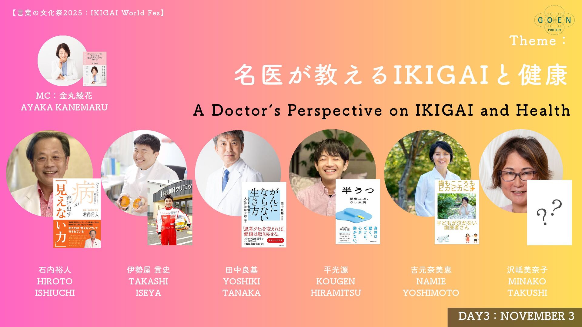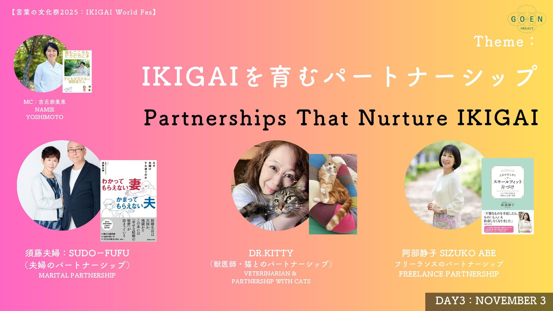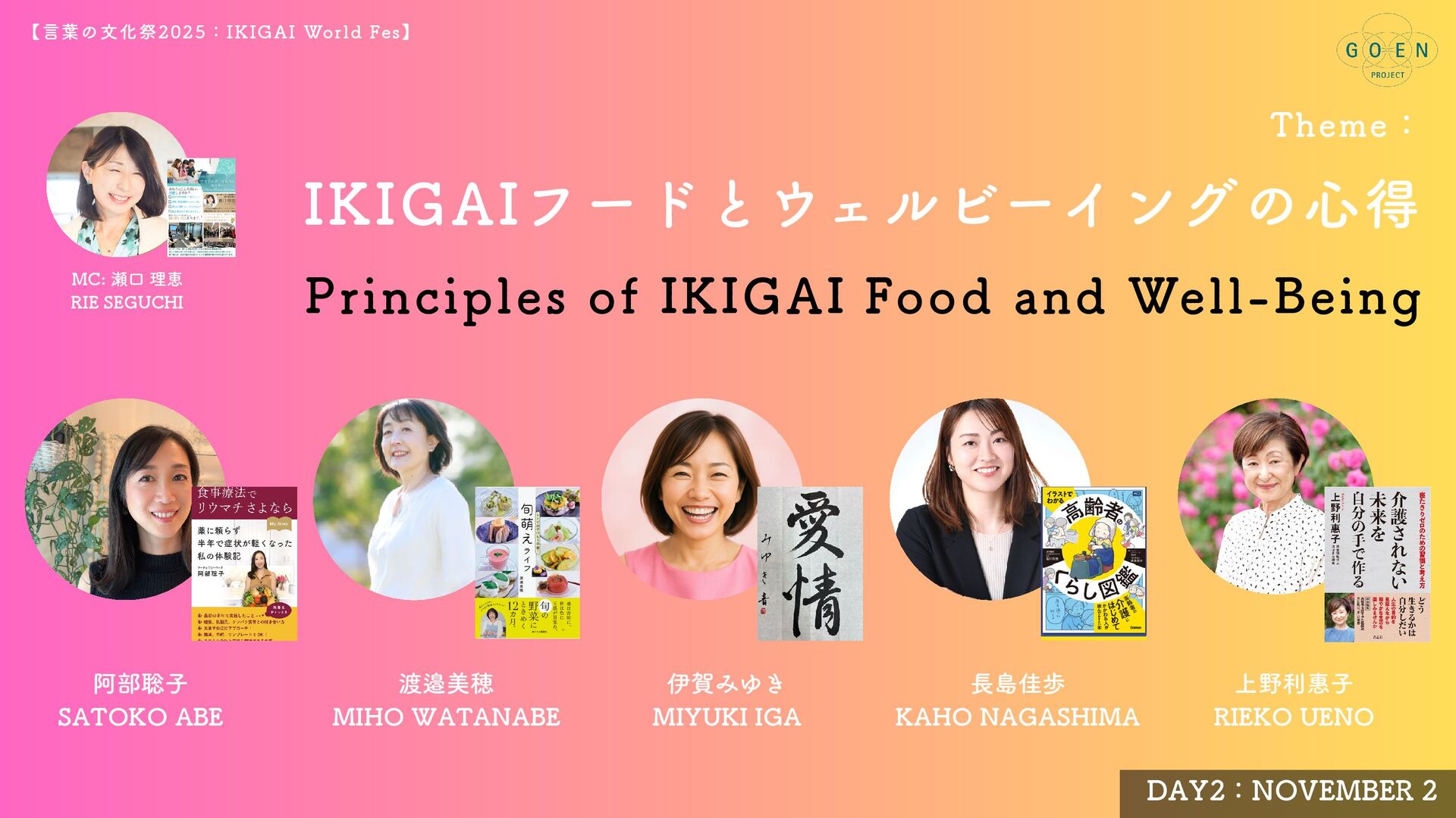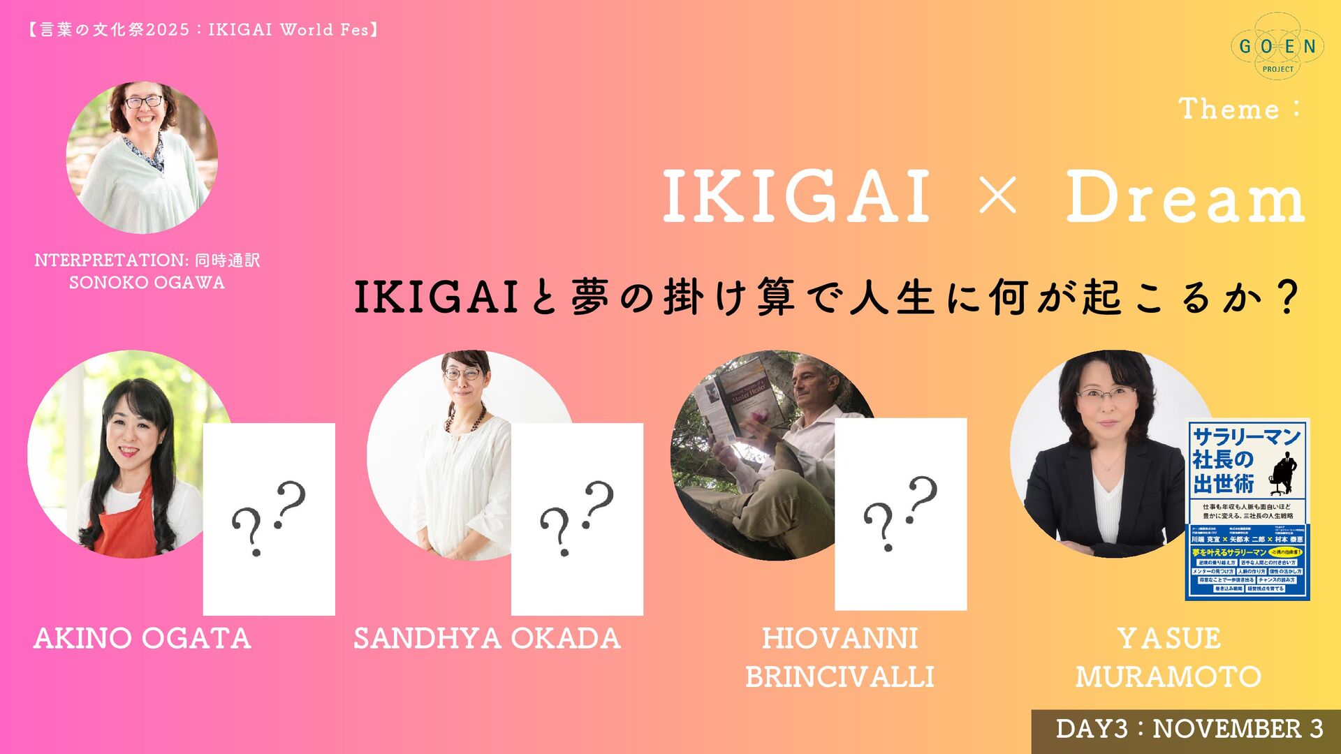 through IKIGAI, in Your Own Way 塙 真弓 MAYUMI HANAWA 大槻 美知子 MICHIKO OTSUKI 大塚 幸子 SACHIKO OTSUKA DAY3:NOVEMBER 3 【言葉の文化祭2025:IKIGAI World Fes】 MC:金丸綾花 AYAKA KANEMARU キューリング恵美子 EMIKO KUEHLING