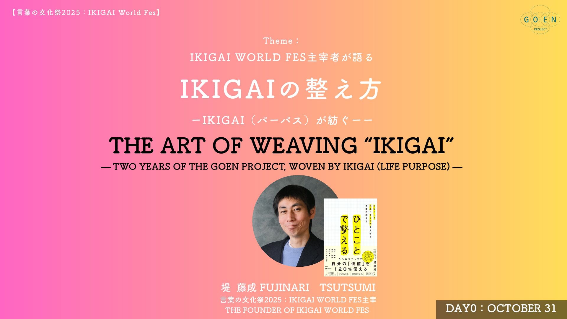 ーIKIGAI(パーパス)が紡ぐーー 堤 藤成 FUJINARI TSUTSUMI 言葉の文化祭2025:IKIGAI WORLD FES主宰 THE FOUNDER OF IKIGAI WORLD FES THE ART OF WEAVING “IKIGAI” — TWO YEARS OF THE GOEN PROJECT, WOVEN BY IKIGAI (LIFE PURPOSE) —