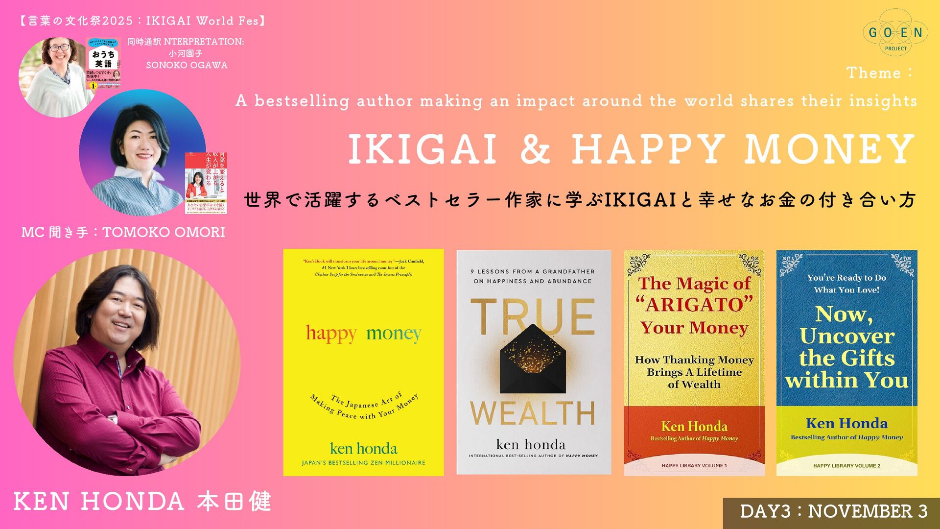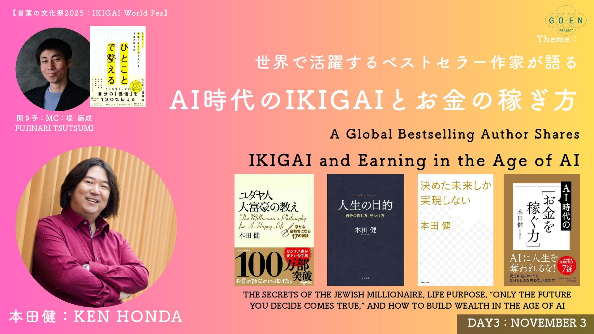 Earning in the Age of AI DAY3:NOVEMBER 3 【言葉の文化祭2025:IKIGAI World Fes】 本田健:KEN HONDA 聞き手:MC:堤 藤成 FUJINARI TSUTSUMI THE SECRETS OF THE JEWISH MILLIONAIRE, LIFE PURPOSE, “ONLY THE FUTURE YOU DECIDE COMES TRUE,” AND HOW TO BUILD WEALTH IN THE AGE OF AI