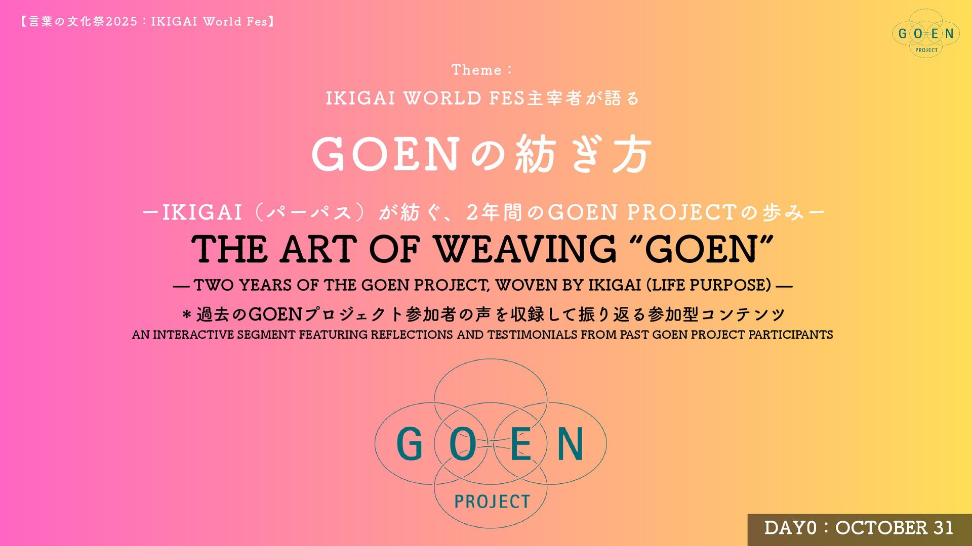 DAY0:OCTOBER 31 THE ART OF WEAVING “GOEN” — TWO YEARS OF THE GOEN PROJECT, WOVEN BY IKIGAI (LIFE PURPOSE) — *過去のGOENプロジェクト参加者の声を収録して振り返る参加型コンテンツ AN INTERACTIVE SEGMENT FEATURING REFLECTIONS AND TESTIMONIALS FROM PAST GOEN PROJECT PARTICIPANTS
