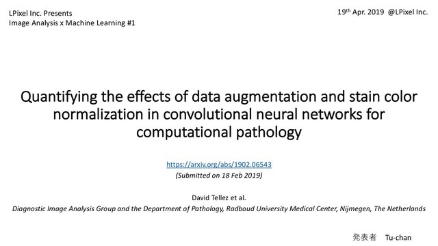 value of the augmen- parameters randomly within certain ranges in variation. We tuned all ranges manually amination. In particular, we used a scaling n [0.8, 1.2], elastic deformation parameters and 2 [9.0, 11.0], additive Gaussian noise 0.1], Gaussian blurring with 2 [0, 0.1], ensity ratio between [0.65, 1.35], and con- y ratio between [0.5, 1.5]. For HSV-light ng, we used hue and saturation intensity ra- [ 0.1, 0.1] and [ 1, 1], respectively. For d HED-strong, we used intensity ratios be- , 0.05] and [ 0.2, 0.2], respectively, for all s. or normalization Figure 4: Network-based stain color normalization. From left to right: patches from the training set are transformed with heavy color augmen- tation and fed to a neural network. This network is trained to reconstruct the original appearance of the input images by removing color augmen- tation, e↵ectively learning how to perform stain color normalization. alize to unseen stains in order to perform well. We eval- uated several methods that implement g (see Fig. 3), and propose a novel technique based on neural networks. Identity. We performed no transformation on the in- put patches, serving as a baseline method for the rest of techniques. Stain color normalization 1. Identity: 何もしない 2. Grayscale: RGB to grayscale - ⾊情報を除く (augmentationはbasic, morphology, BCのみ) 3. LUT-based 核を検出して⾊の標準化 テンプレWSIからlook-up table (LUT)を作成する 4. Network-based(右図) Downward 5 layers, BN, LRA Upward 5 layers, nearest-neighbor upsampling + 1 conv BN, LRA+tanh, 64-sample mini-batch 4臓器のWSIから 500Kパッチ集めて使⽤ HSV augmentation (color transformation only) HSV value channel ratios b/w [-1, 1]