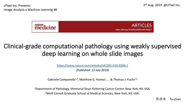 and breast metastases) that our prostate model would allow the removal of more than 75% of the slides from the workload of a pathologist without any loss in sensitivity at the patient level. For pathologists who must operate in the increasingly complex, detailed and data-driven environment of cancer diagnostics, tools such as this will allow non-subspecialized pathologists to confidently and efficiently classify cancer with 100% sensitivity. Online content Any methods, additional references, Nature Research reporting summaries, source data, statements of code and data availability and associated accession codes are available at https://doi.org/10.1038/ s41591-019-0508-1. Received: 23 October 2018; Accepted: 3 June 2019; Published: xx xx xxxx References 1. Ball, C. S. The early history of the compound microscope. Bios 37, 51–60 (1966). 2. Hajdu, S. I. Microscopic contributions of pioneer pathologists. Ann. Clin. Lab. Sci. 41, 201–206 (2011). 3. Fuchs, T. J., Wild, P. J., Moch, H. & Buhmann, J. M. Computational pathology analysis of tissue microarrays predicts survival of renal clear cell carcinoma 13. Liu, Y. et al. Detecting cancer metastases on gigapixel pathology images. Preprint at https://arxiv.org/abs/1703.02442 (2017). 14. Das, K., Karri, S. P. K., Guha Roy, A, Chatterjee, J. & Sheet, D. Classifying histopathology whole-slides using fusion of decisions from deep convolutional network on a collection of random multi-views at multi- magnification. In 2017 IEEE 14th International Symposium on Biomedical Imaging 1024–1027 (IEEE, 2017). 15. Valkonen, M. et al. Metastasis detection from whole slide images using local features and random forests. Cytom. Part A 91, 555–565 (2017). 16. Bejnordi, B. E. et al. Using deep convolutional neural networks to identify and classify tumor-associated stroma in diagnostic breast biopsies. Mod. Pathol. 31, 1502–1512 (2018). 17. Mobadersany, P. et al. Predicting cancer outcomes from histology and genomics using convolutional networks. Proc. Natl Acad. Sci. USA 115, E2970–E2979 (2018). 18. Wang, D., Khosla, A., Gargeya, R., Irshad, H. & Beck, A. H. Deep learning for identifying metastatic breast cancer. Preprint at https://arxiv.org/ abs/1606.05718 (2016). 19. Janowczyk, A. & Madabhushi, A. Deep learning for digital pathology image analysis: a comprehensive tutorial with selected use cases. J. Pathol. Inform. 7, 29 (2016). 20. Litjens, G. et al. Deep learning as a tool for increased accuracy and efficiency of histopathological diagnosis. Sci. Rep. 6, 26286 (2016). 21. Coudray, N. et al. Classification and mutation prediction from non-small cell lung cancer histopathology images using deep learning. Nat. Med. 24, 1559–1567 (2018). 22. Olsen, T. et al. Diagnostic performance of deep learning algorithms applied to three common diagnoses in dermatopathology. J. Pathol. Inform. 9, 32 (2018). 23. Ehteshami Bejnordi, B. et al. Diagnostic assessment of deep learning Predicted positive Predicted negative 0 0.25 0.50 0.75 1.00 0 0.25 0.50 0.75 1.00 0 25 50 75 100 % slides reviewed Sensitivity Probability Tumor probability Cases a b Fig. 6 | Impact of the proposed decision support system on clinical practice. a, By ordering the cases, and slides within each case, based on their tumor probability, pathologists can focus their attention on slides that are probably positive for cancer. b, Following the algorithm’s prediction would allow pathologists to potentially ignore more than 75% of the slides while retaining 100% sensitivity for prostate cancer at the case level (n=1,784). 各症例には,癌があるスライド とないスライドが混ざっている 癌があるかな〜と思いながら 順に⾒ていくしかない ig. 6 (see Extended Data Fig. 6 for BCC and breast metastases) our prostate model would allow the removal of more than 75% he slides from the workload of a pathologist without any loss in 13. Liu, Y. et al. Detecting cancer metastases on gig Preprint at https://arxiv.org/abs/1703.02442 (20 14. Das, K., Karri, S. P. K., Guha Roy, A, Chatterjee histopathology whole-slides using fusion of dec Predicted positive Predi nega 0 0.25 0.50 0 0.25 0.50 0.75 1.00 0 25 50 % slides reviewed Sensitivi Probability s 6 | Impact of the proposed decision support system on clinical practice. a, By ordering the cases, and slides within each c ability, pathologists can focus their attention on slides that are probably positive for cancer. b, Following the algorithm’s pr ologists to potentially ignore more than 75% of the slides while retaining 100% sensitivity for prostate cancer at the case l こちらはスルーできる ポジティブス ライドに集中 ARTICLES NATURE MEDICINE ⽪膚がん (n=1575) threshold 0.025 乳癌LN転移 (n=1473) 65% 65% threshold 0.25 診断で重要なのは,患者レベルで癌の⾒落と しがないこと -> 感度100%が必要 感度100%にあげても,気合を⼊れてチェック するスライドは3割程度.仕事量の65〜75%が エネルギーダウンできる in Fig. 6 (see Extended Data Fig. 6 for BCC and breast metastases) that our prostate model would allow the removal of more than 75% of the slides from the workload of a pathologist without any loss in sensitivity at the patient level. For pathologists who must operate in the increasingly complex, detailed and data-driven environment of cancer diagnostics, tools such as this will allow non-subspecialized pathologists to confidently and efficiently classify cancer with 100% sensitivity. Online content 13. Liu, Y. et al. Detecting cancer metastases on gigapixel pathology images. Preprint at https://arxiv.org/abs/1703.02442 (2017). 14. Das, K., Karri, S. P. K., Guha Roy, A, Chatterjee, J. & Sheet, D. Classifying histopathology whole-slides using fusion of decisions from deep convolutional network on a collection of random multi-views at multi- magnification. In 2017 IEEE 14th International Symposium on Biomedical Imaging 1024–1027 (IEEE, 2