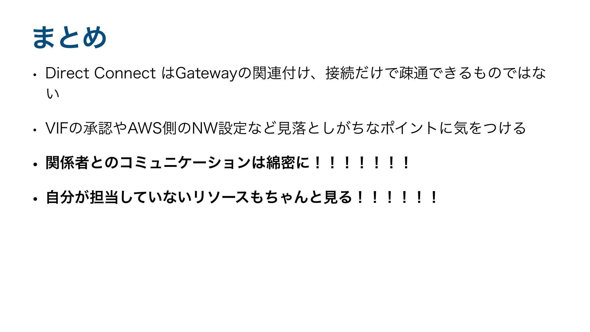 ·ͱΊ w %JSFDU$POOFDU(BUFXBZͷؔ࿈͚ɺଓ͚ͩͰૄ௨Ͱ͖ΔͷͰͳ ͍ w 7*'ͷঝೝ"84ଆͷ/8ઃఆͳͲݟམͱ͕ͪ͠ͳϙΠϯτʹؾΛ͚ͭΔ w ؔऀͱͷίϛϡχέʔγϣϯ໖ີʹʂʂʂʂʂʂʂ w ͕ࣗ୲͍ͯ͠ͳ͍ϦιʔεͪΌΜͱݟΔʂʂʂʂʂʂ