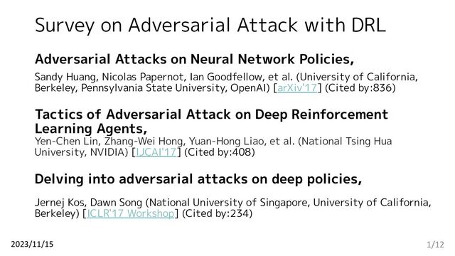 Sandy Huang, Nicolas Papernot, Ian Goodfellow, et al. (University of California, Berkeley, Pennsylvania State University, OpenAI) [arXiv'17] (Cited by:836)