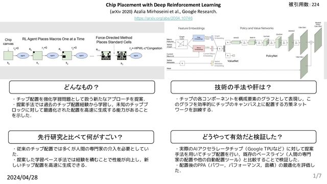 を示した. どんなもの? 先行研究と比べて何がすごい? 技術の手法や肝は? どうやって有効だと検証した? ・実際のAIアクセラレータチップ(Google TPUなど)に対して提案 手法を用いてチップ配置を行い,既存のベースライン(人間の専門 家の配置や他の自動配置ツール)と比較することで検証した. ・配置後のPPA(パワー,パフォーマンス,面積)の最適化を評価し た. Chip Placement with Deep Reinforcement Learning (arXiv 2020) Azalia Mirhoseini et al., Google Research. https://arxiv.org/abs/2004.10746 2024/04/28 論文を表す画像 被引用数:224 1/7
