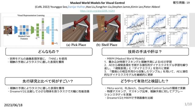 ションスタディを実施 ・DreamerV2とMWMで予測画像を比較 ・MWM (Masked World Models) 1.畳み込み特徴マスキングと報酬予測によるAEの学習 2.AEから視覚表現を予測する潜在的ダイナミクスモデル学習を繰り 返し,「視覚表現」と「ダイナミクス」を別々に更新 3.「環境との相互作用から収集したサンプル」を用いて,AEと潜在 的なダイナミクスモデルを継続的に更新 ・世界モデルの画像表現学習に,「MAE」を使用 ・報酬の予測によりタスクに適した表現を獲得 Masked World Models for Visual Control (CoRL 2022) Younggyo Seo,Danijar Hafner,Hao Liu,Fangchen Liu,Stephen James,Kimin Lee,Pieter Abbeel https://arxiv.org/abs/2206.14244 2023/06/18 論文を表す画像 被引用数:19 1/10