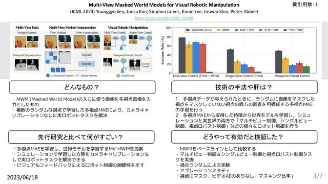 クを実施 ・視点ランダムによる実験 ・アブレーションスタディ 「視点にマスク,ビデオAEのありなし,マスキング比率」 1.多視点データが与えられたときに,ランダムに画像をマスクした 視点をマスクしていない視点の両方の画素を再構成する多視点MAE の学習を行う 2.多視点MAEから取得した特徴から世界モデルを学習し,シミュ レーションと実世界の両方で「マルチビュー制御,シングルビュー 制御,視点ロバスト制御」などの様々なロボット制御を行う ・MWM (Masked World Model)の入力に使う画像を多視点画像を入 力としたもの ・複数のランダムな視点で学習した多視点MAEにより,カメラキャ リブレーションなしに実ロボットタスクを解決 Multi-View Masked World Models for Visual Robotic Manipulation (ICML 2023) Younggyo Seo, Junsu Kim, Stephen James, Kimin Lee, Jinwoo Shin, Pieter Abbeel https://arxiv.org/abs/2302.02408 2023/06/18 論文を表す画像 被引用数:1 1/7
