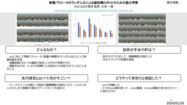 ・歩行タスクに対して,報酬関数を設計した ・次のスライドで詳細を説明 ・antに対して物理パラメータ (質量や摩擦)のランダム化によって故 障状態を作成 ・故障係数kを0~1の範囲で設定してPPOで学習させた ・提案手法では,k=0.9で故障による変化にも対応できていることを 示した 物理パラメータのランダム化による耐故障ロボットのための強化学習 (JSAI 2020)岡本 航昇, 川本 一彦 https://www.jstage.jst.go.jp/article/pjsai/JSAI2020/0/JSAI2020_3Rin402/_pdf 2024/01/26 論文を表す画像 被引用数:- 1/5