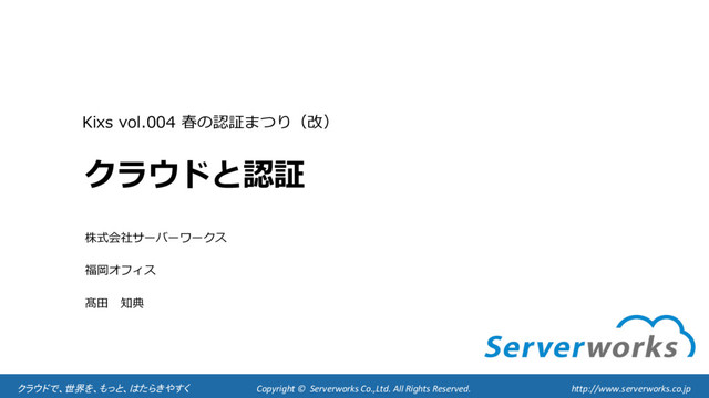 クラウドで、世界を、もっと、はたらきやすく Copyright © Serverworks Co.,Ltd. All Rights Reserved. http://www.serverworks.co.jp クラウドと認証