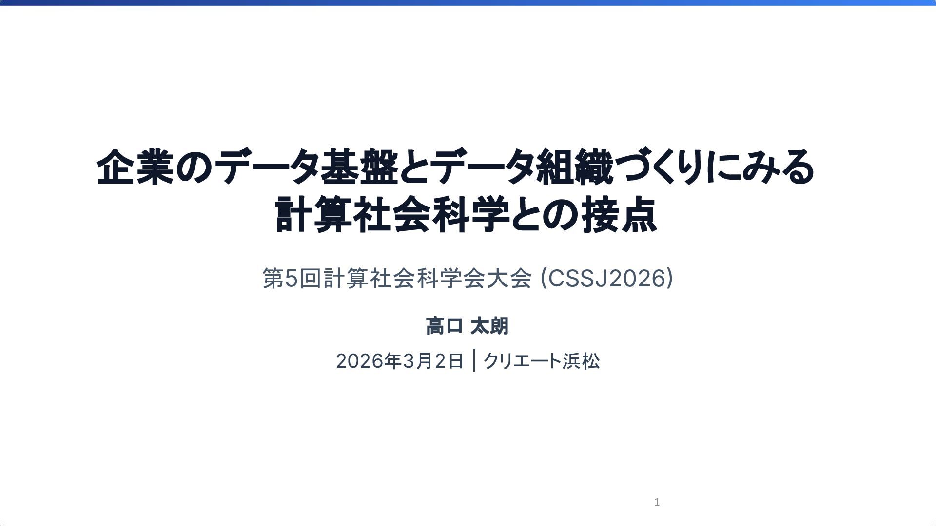 企業のデータ基盤とデータ組織づくりにみる 計算社会科学との接点 第5回計算社会科学会大会 CSSJ2026 高口 太朗 2026年3月2日 | クリエート浜松 1