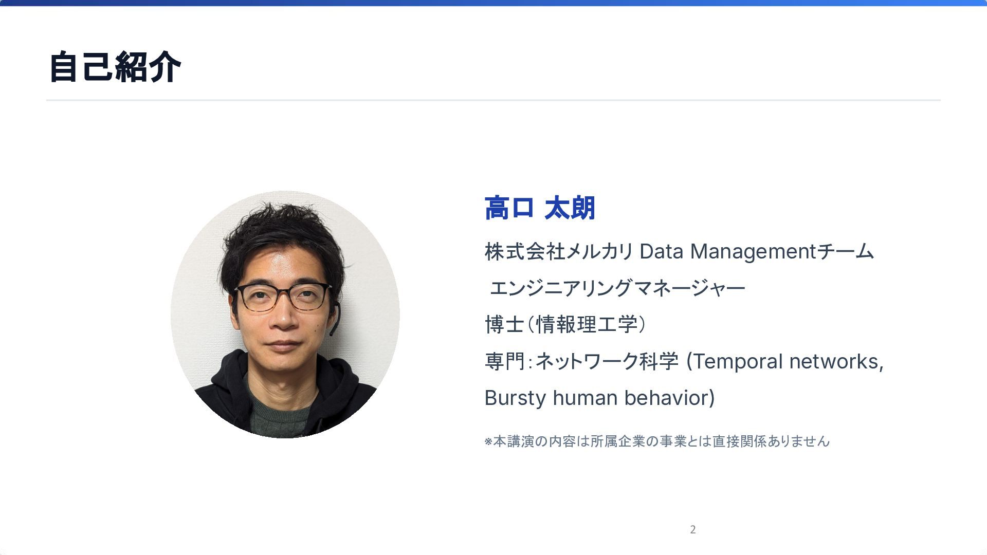 高口 太朗 株式会社メルカリ Data Managementチーム エンジニアリングマネージャー 博士(情報理工学) 専門:ネットワーク科学 Temporal networks,